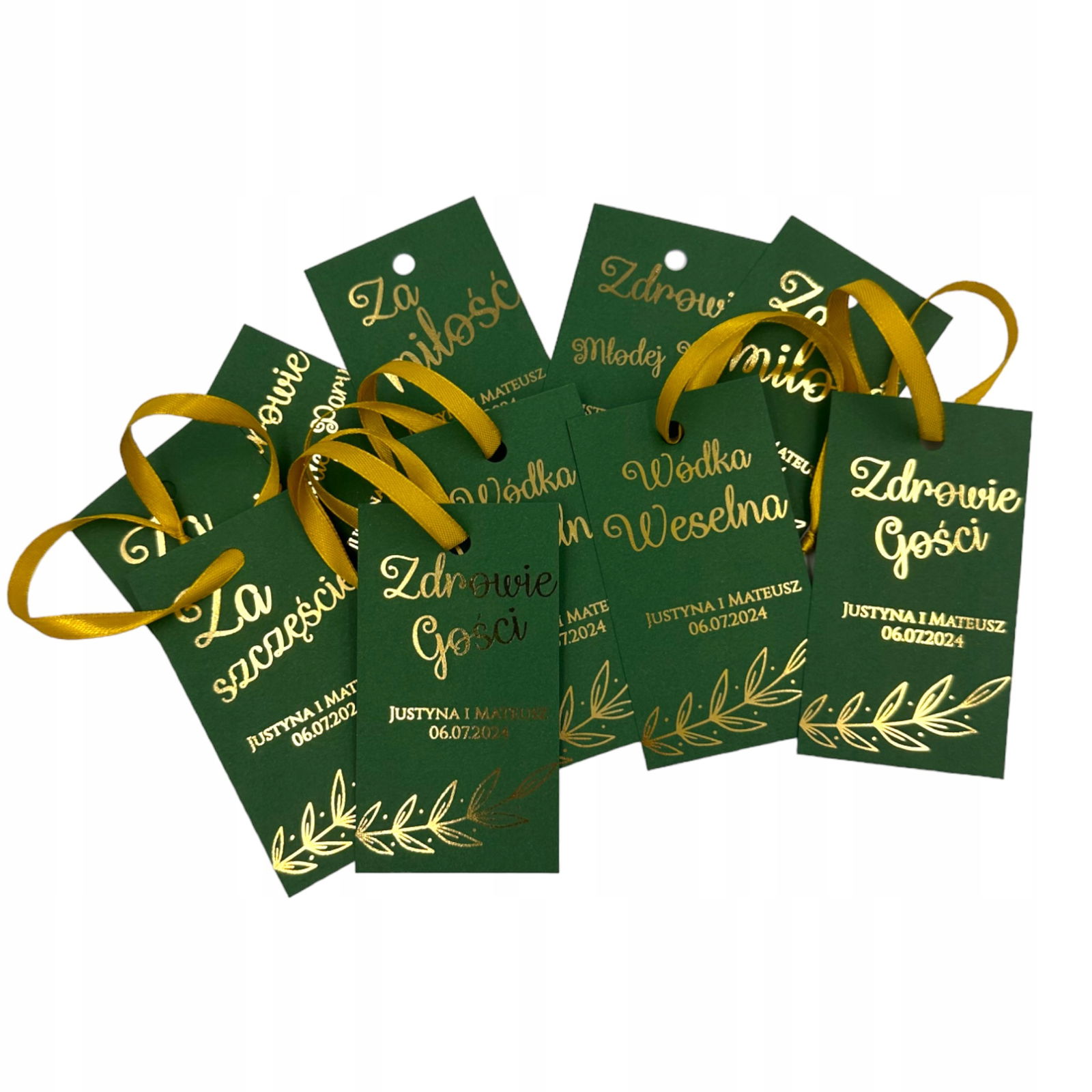 ZAWIESZKI złocone etykiety na alkohol Wódkę Weselną 50szt Zielone PR910