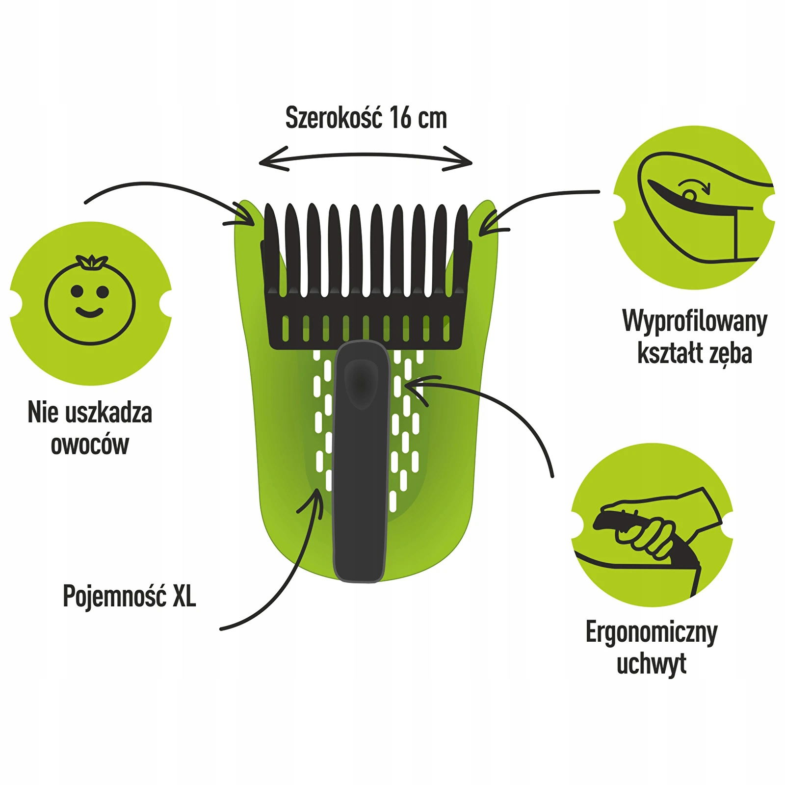 Perfekcyjne zbieranie drobnych owoców - korzystając z tej praktycznej zbieraczki wygodnie i z łatwością zbierzesz jagody, borówki, porzeczki, aronię i inne drobne owoce, jakie uprawiasz. Wygoda użytkowania - zbieraczka została zaprojektowana z myślą o Twoim komforcie pracy: ma ergonomiczny, zoptymalizowany kształt, wygodną rączkę, „oddychający” (dzięki perforacji) spód korpusu, pojemny i wysoki koszyczek. Lekkość i wytrzymałość - zbieraczka wykonana jest z lekkiego, a przy tym trwałego tworzywa, łatwego do utrzymania w czystości. Wysoka jakość i elegancja - docenisz trwałość korpusu zbieraczki, wygodny uchwyt dopasowany do kształtu dłoni, a także piękną, kompaktową formę całości. Bezpieczeństwo dla owoców i krzewów - odpowiednio wyprofilowane elastyczne zęby grzebienia i brak ostrych krawędzi to atuty tej zbieraczki, zapewniające zminimalizowanie ryzyka uszkodzenia owoców i krzewów. Autorski projekt, polska produkcja - efektowne połączenie funkcjonalności i atrakcyjnego designu.
