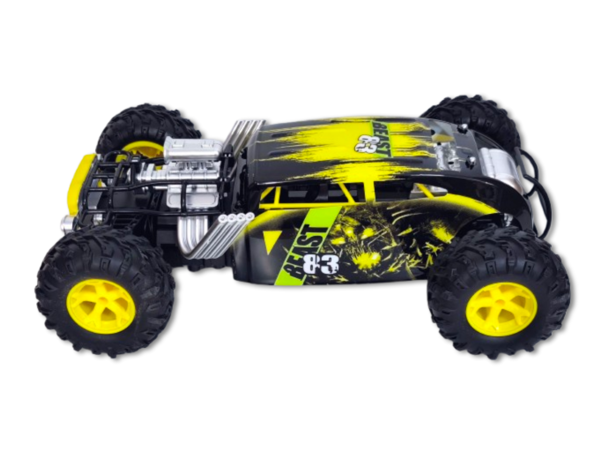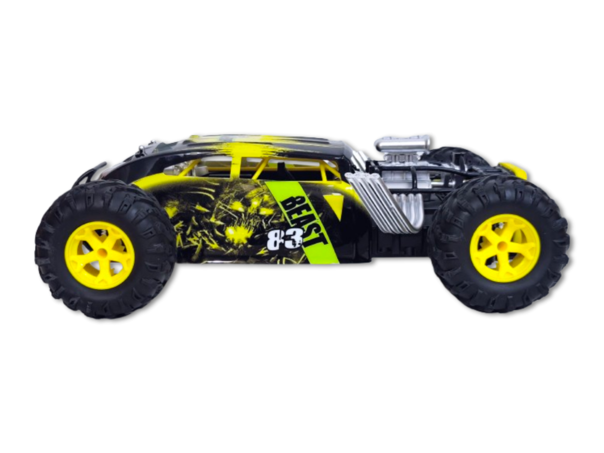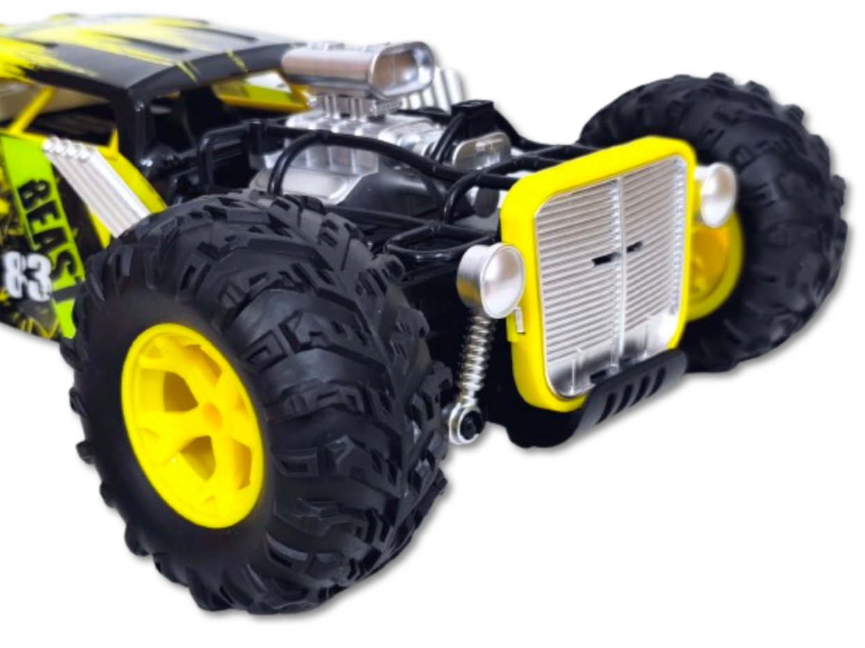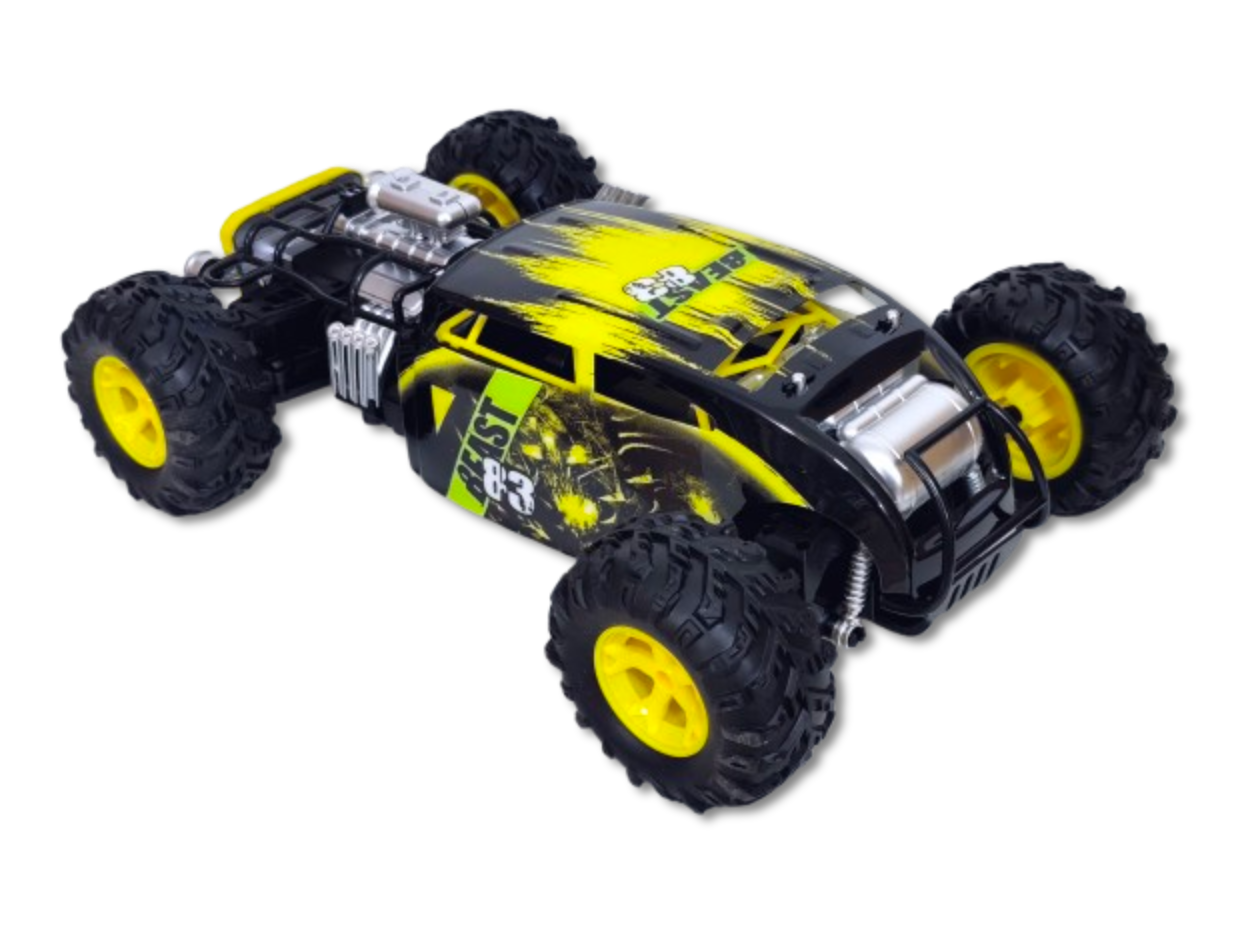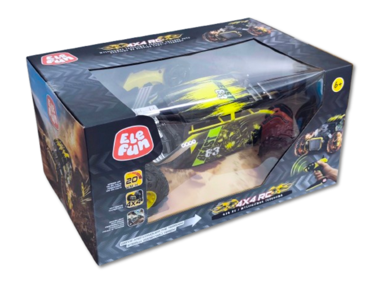 Zdalnie sterowane auto terenowe 4x4 z napędem na 4 koła marki Elefun rozpędzające się do 20km/h. Samochód jest dynamiczny, szybki, zwrotny, świetnie się sprawdza zarówno w domu jak i na zewnątrz. Terenówka posiada zdejmowaną "karoserię", duże gumowe koła o średnicy 10cm zapewniające mu bardzo dobrą przyczepność, a dzięki napędowi na 4 koła pojazd świetnie sobie radzi za równo z jazdą po dywanach jak też w trudnym terenie po leśnych ścieżkach. Zabawka pracuje na częstotliwości 2,4GHz (zakres częstotliwości 2405-2475Mhz), pilot zdalnego sterowania jest bardzo wygodny, umożliwia sterowanie autem do przodu, tyłu, w lewą i prawą na odległość do około 20m. Terenówka zasilana jest akumulatorem Litowo-Jonowym 7,4V o pojemności 1,200mAh, pilot 2 bateriami AA 1,5V (duże paluszki) - baterie nie są dołączone do zestawu. W zestawie z autem znajduje się przewód USB służący do ładowania akumulatora, które trwa około 180min. Zabawka jest przeznaczona dla dzieci powyżej 6 roku życia.