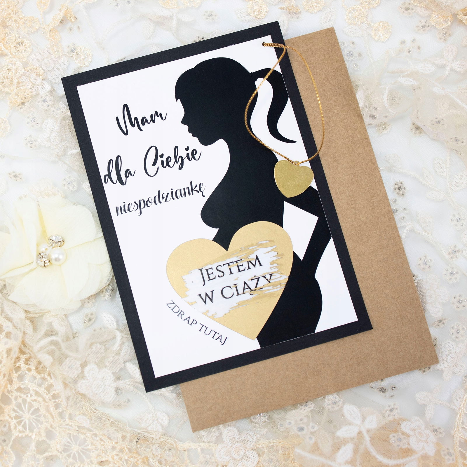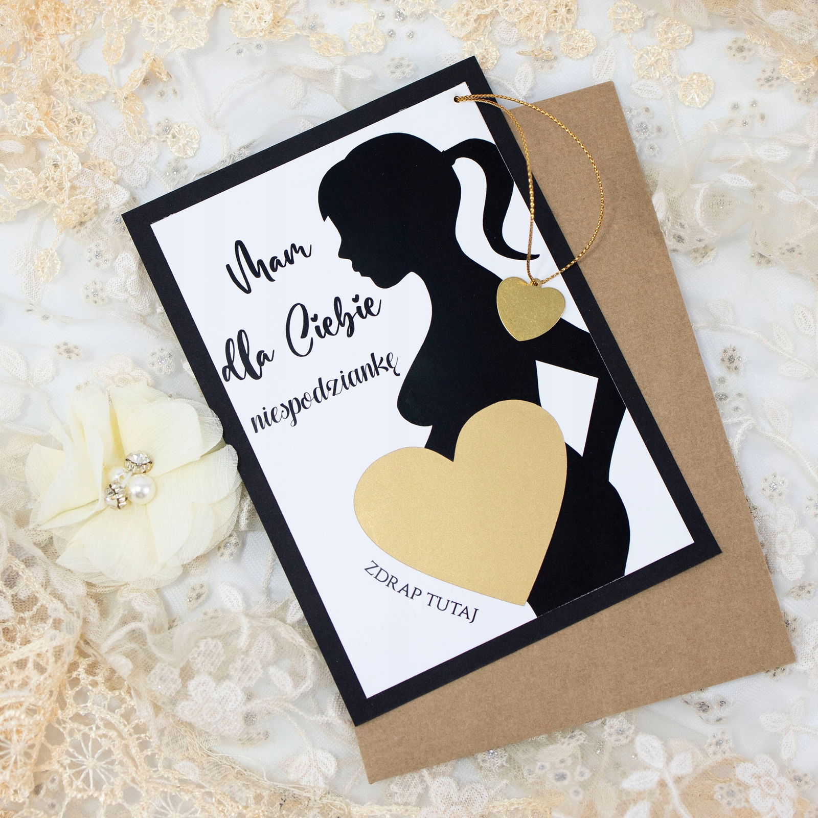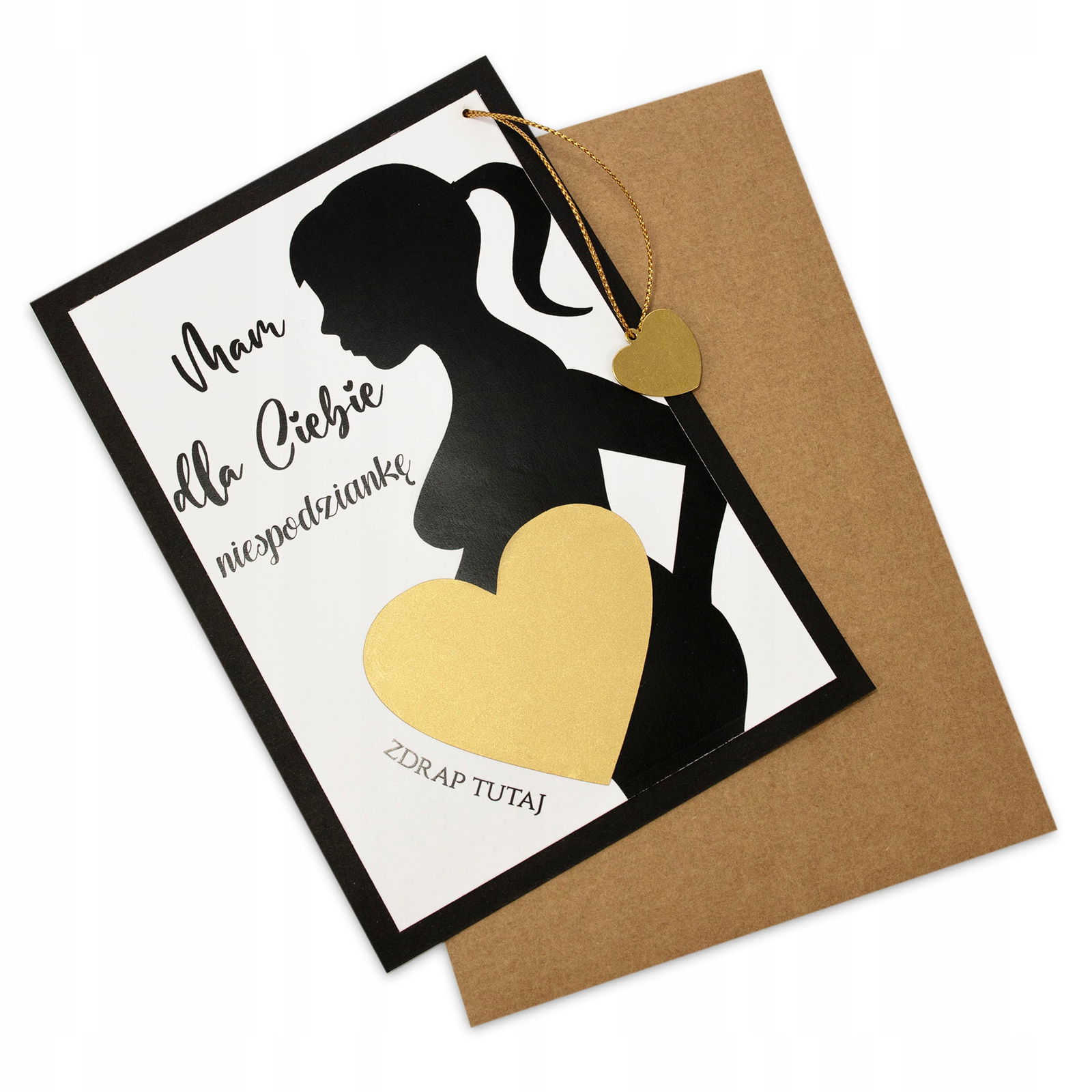 Oryginalny pomysł na poinformowanie ukochanego o tym, że zostanie dziadkiem. Do kartki dołączone jest urocze małe złote serduszko do zdrapywania. Pod złotą zdrapką ukryte jest informacja: "JESTEM W CIĄŻY".