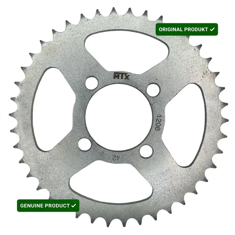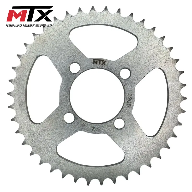 Zębatka tylna MTX PARTS o 42 zębach, przeznaczona do współpracy z łańcuchem o podziałce 428. Wykonana z wysokiej jakości stali, zapewnia trwałość i niezawodność w układzie napędowym motocykla.