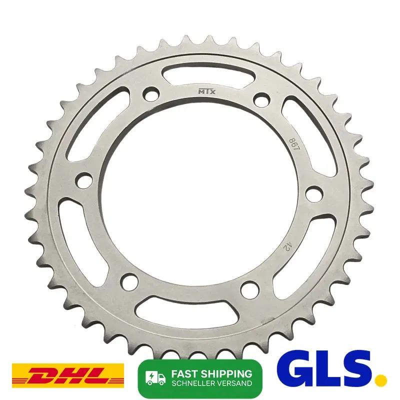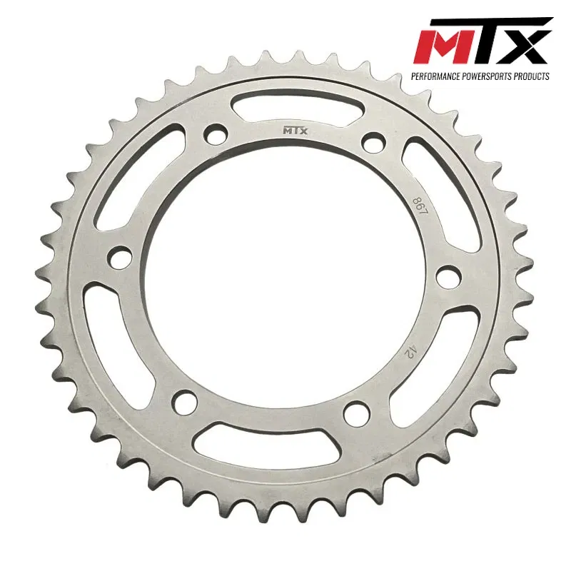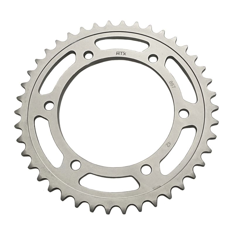 Zębatka tylna MTX PARTS o 42 zębach, przeznaczona do współpracy z łańcuchem o rozmiarze 525. Wykonana z wysokiej jakości stali, zapewnia trwałość i niezawodność w układzie napędowym motocykla. Jest to element kluczowy dla prawidłowego przeniesienia mocy z silnika na koło.