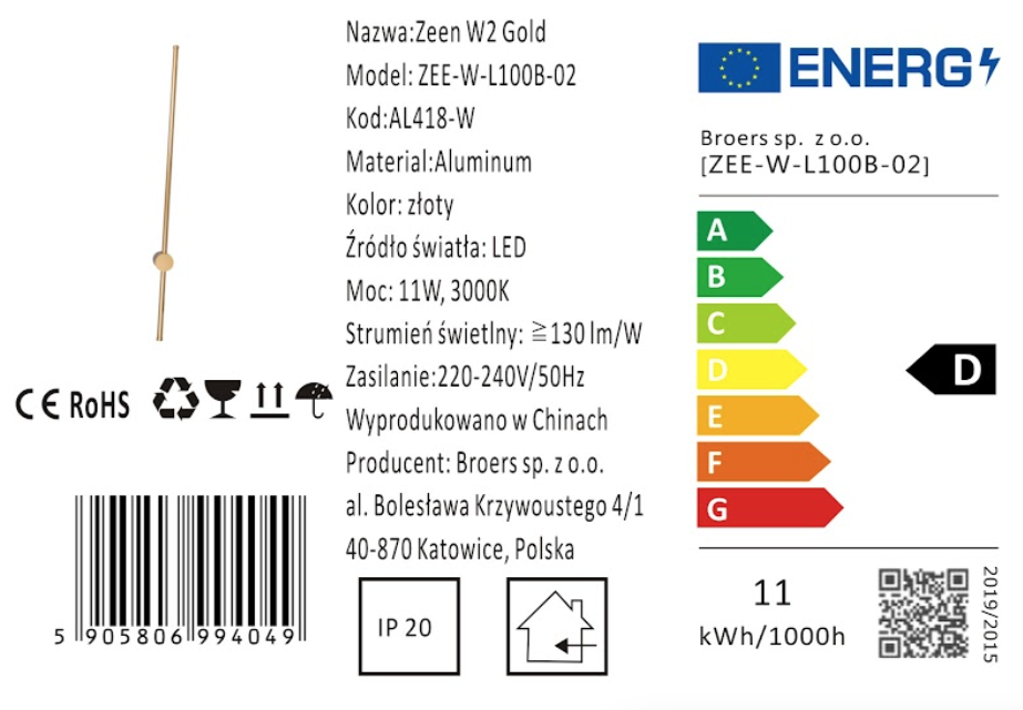 Klasa Szczelności IP20: Zeen W2 posiada klasę szczelności IP20, co oznacza, że jest idealna do użytku wewnątrz pomieszczeń, dodając blasku salonowi, sypialni czy korytarzowi.