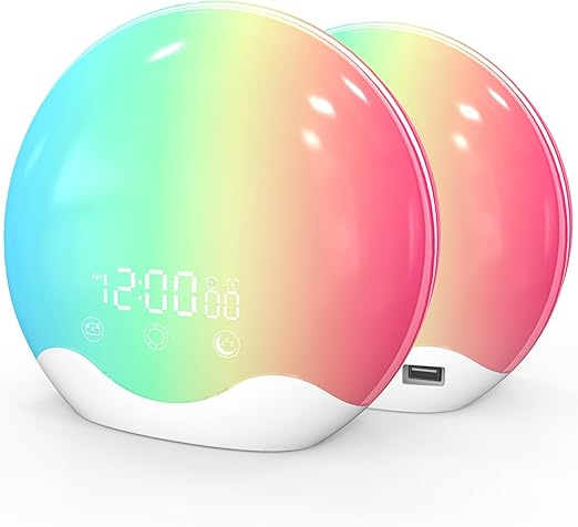 - 【6 kolorowych świateł LED + 6 efektów świetlnych RGB】Światło do budzenia obejmuje 6 jednolitych kolorów i 6 miękkich mieszanych kolorów od słońca do zorzy polarnej / płomienia / śnieżnej góry. Pod kolorowym, dynamicznym efektem świetlnym, realizuje promienny efekt wizualny i tworzy romantyczną i kojącą atmosferę. Dzięki 20 regulowanym jasnościom możesz wybrać dowolne tryby oświetlenia, takie jak lampka nocna / światło dzienne / światło nocne / światło terapeutyczne / światło do czytania / światło nastrojowe / światło nastrojowe.