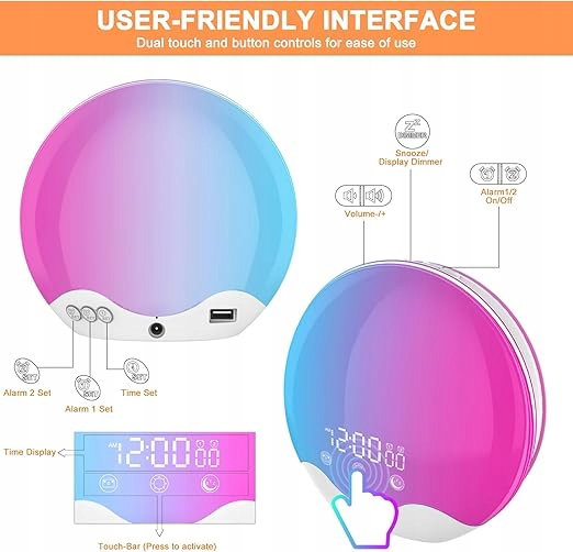 - 【Dwustronne oświetlenie z inteligentną symulacją wschodu/zachodu słońca】Tryb wschodu słońca: 10–60 minut poprzez stopniowe zwiększanie światła od 10% do 100%; Tryb uśpienia: 10–120 minut zachodu słońca poprzez delikatne przyciemnienie światła od 100% do 0%, gdy oba światła i radio FM można osłabić lub wyłączyć osobno. Naturalny budzik wschodu i zachodu słońca poprawia sen, energię i samopoczucie. Dwustronna konstrukcja oświetlenia zapewnia równomierne, powierzchniowe oświetlenie.