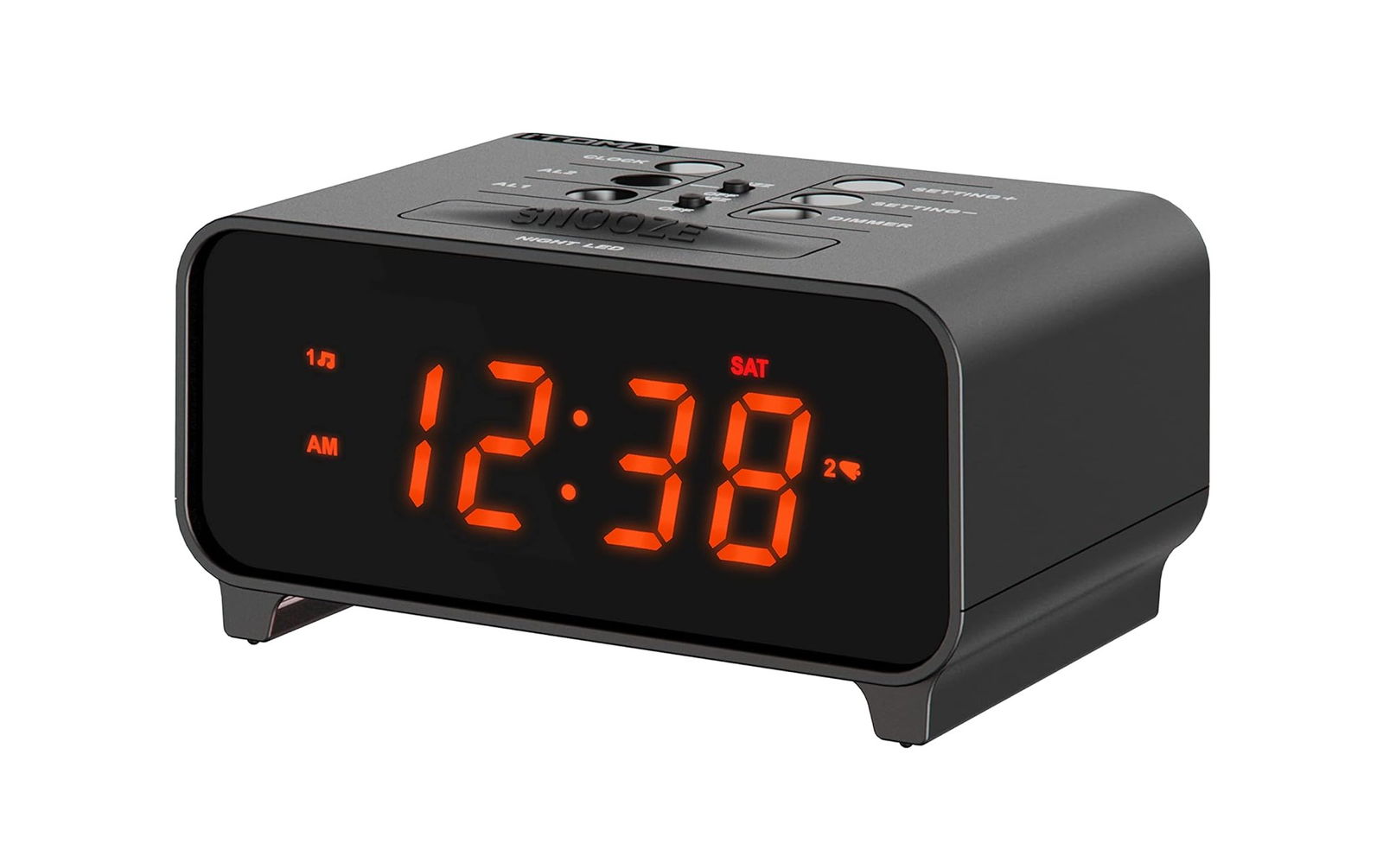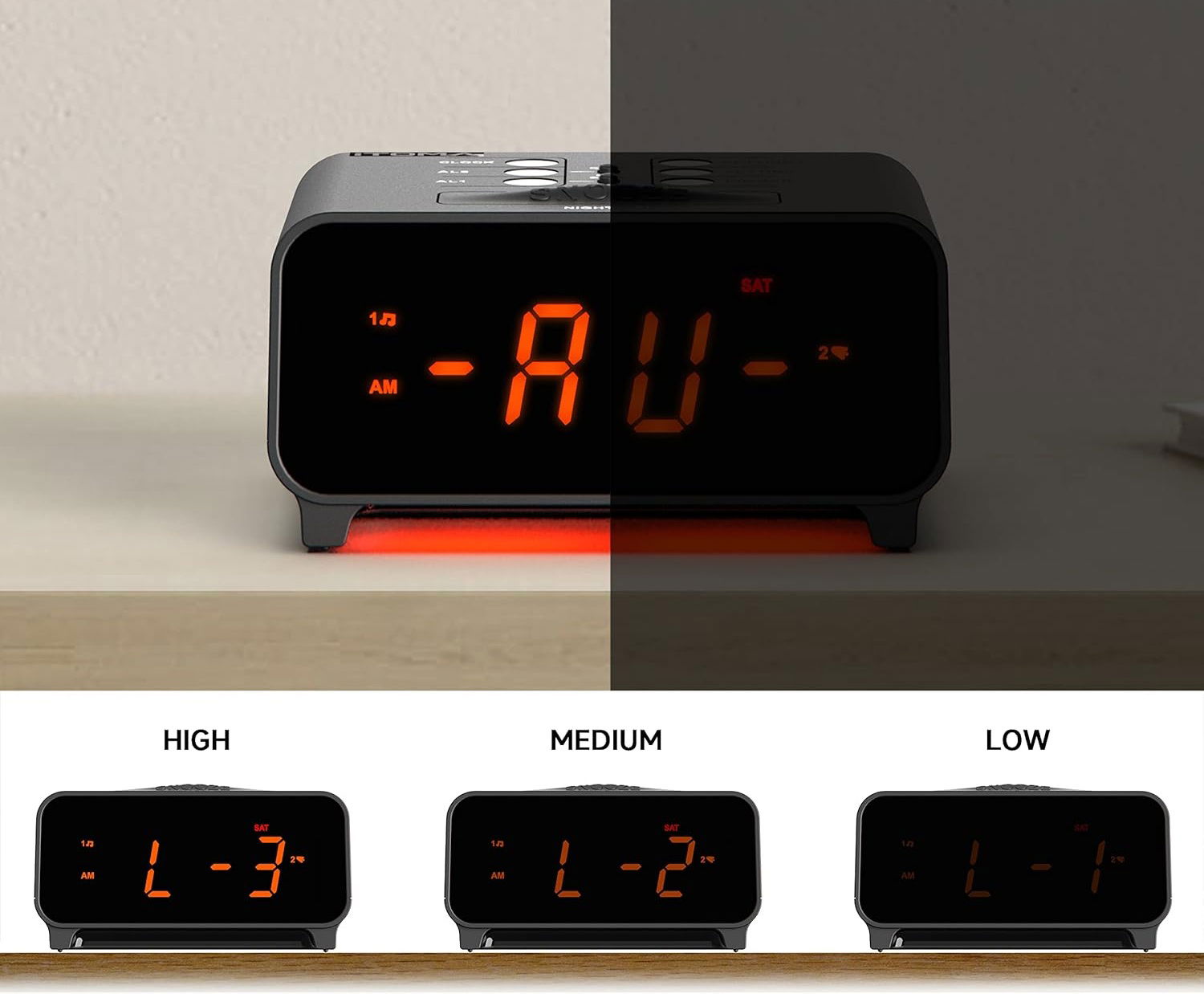 - Jasność wyświetlacza zegara zostanie automatycznie dostosowana pod różnymi warunkami źródła światła.
