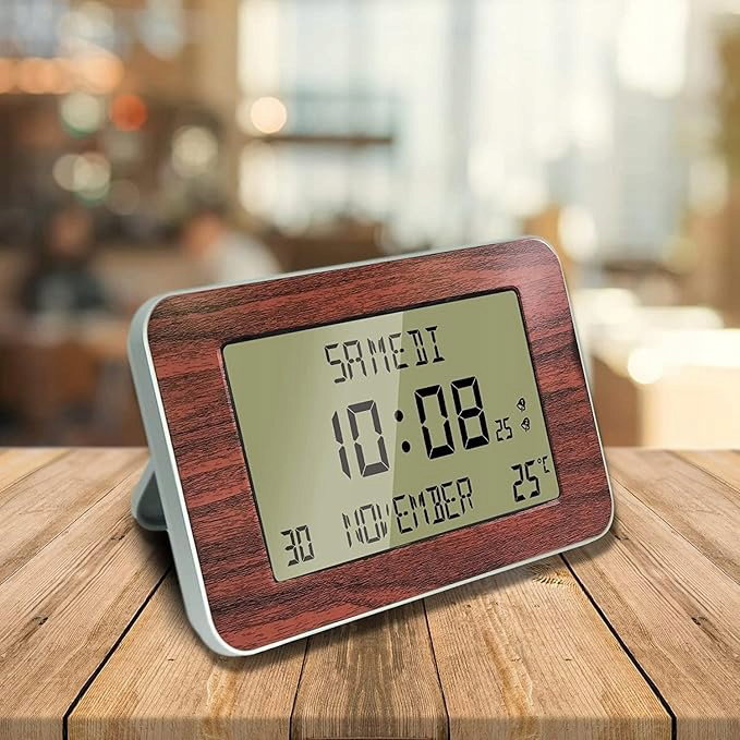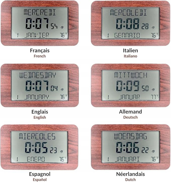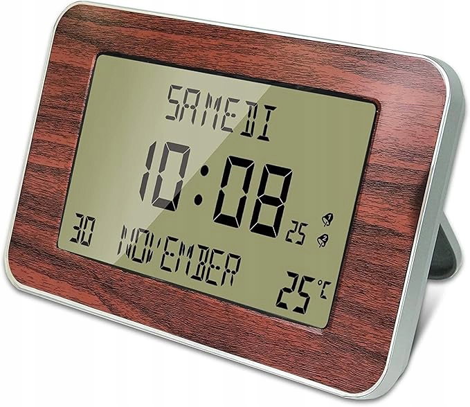 Zegar ścienny radiowy cyfrowy budzik - Kalendarz daty i godziny - Duże cyfry - 6 języków - 2 alarmy - Temperatura otoczenia - wieszak ścienny lub stojący - 24 x 14 cm - wzór drewna
