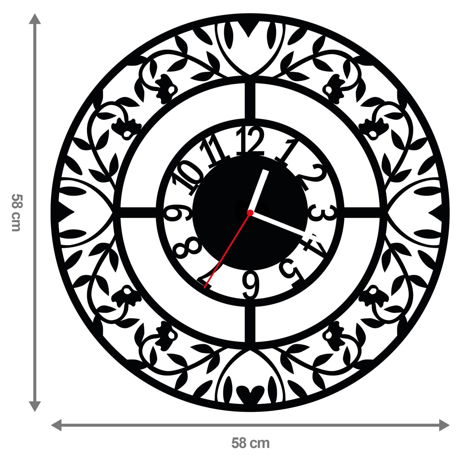 - DUŻA ŚREDNICA 58 cm – zegar posiada imponująco duży rozmiar, co sprawia, że będzie widoczny z daleka. Doskonale sprawdzi się zarówno w domu, biurze, szkole i innych większych pomieszczeniach.