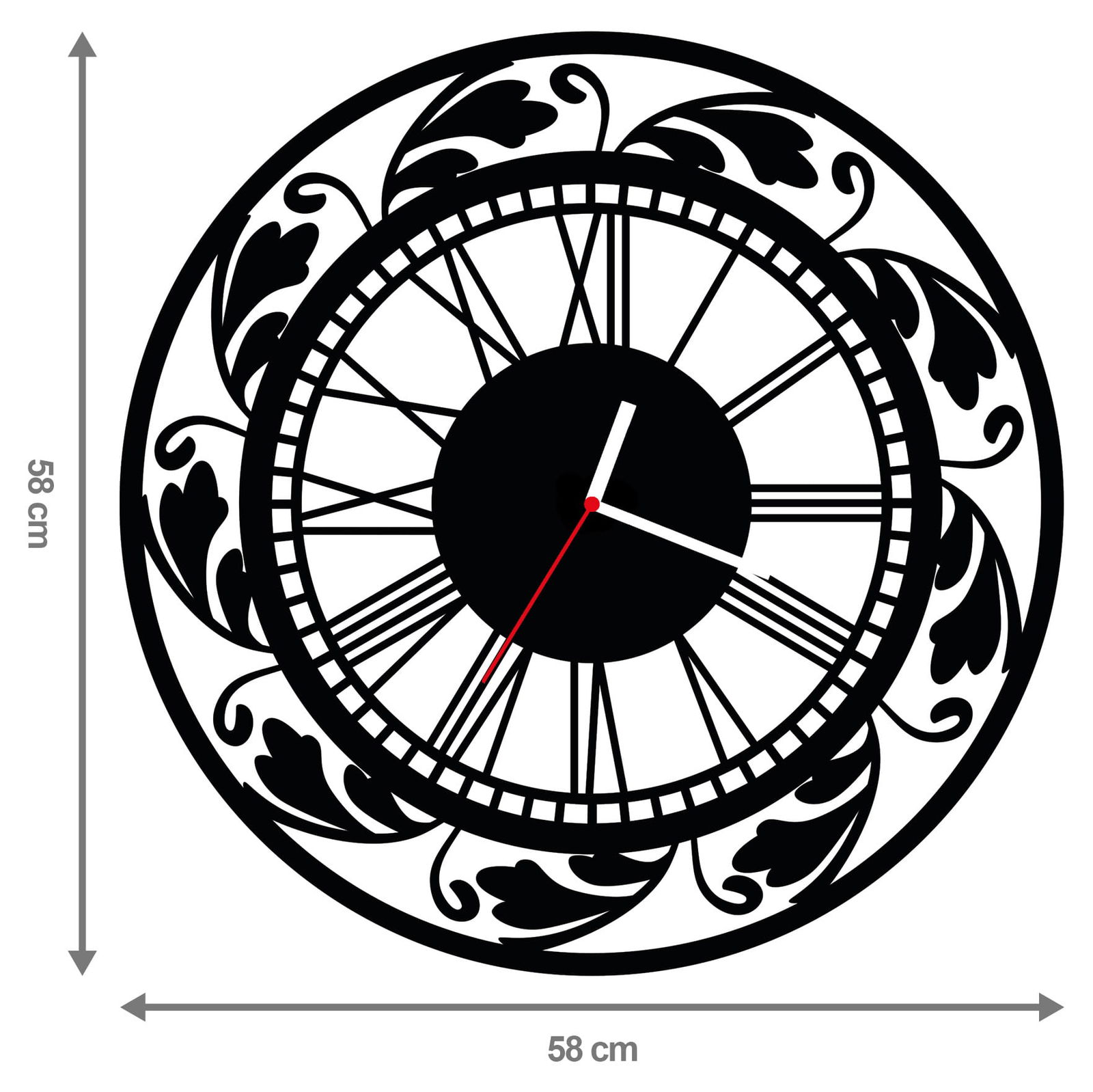 - DUŻA ŚREDNICA 58 cm – zegar posiada imponująco duży rozmiar, co sprawia, że będzie widoczny z daleka. Doskonale sprawdzi się zarówno w domu, biurze, szkole i innych większych pomieszczeniach.