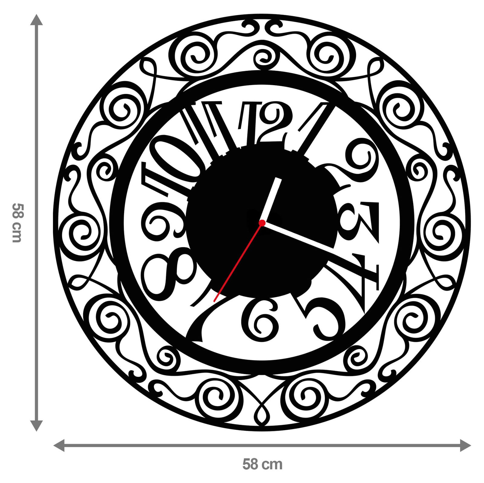 - DUŻA ŚREDNICA 58 cm – zegar posiada imponująco duży rozmiar, co sprawia, że będzie widoczny z daleka. Doskonale sprawdzi się zarówno w domu, biurze, szkole i innych większych pomieszczeniach.