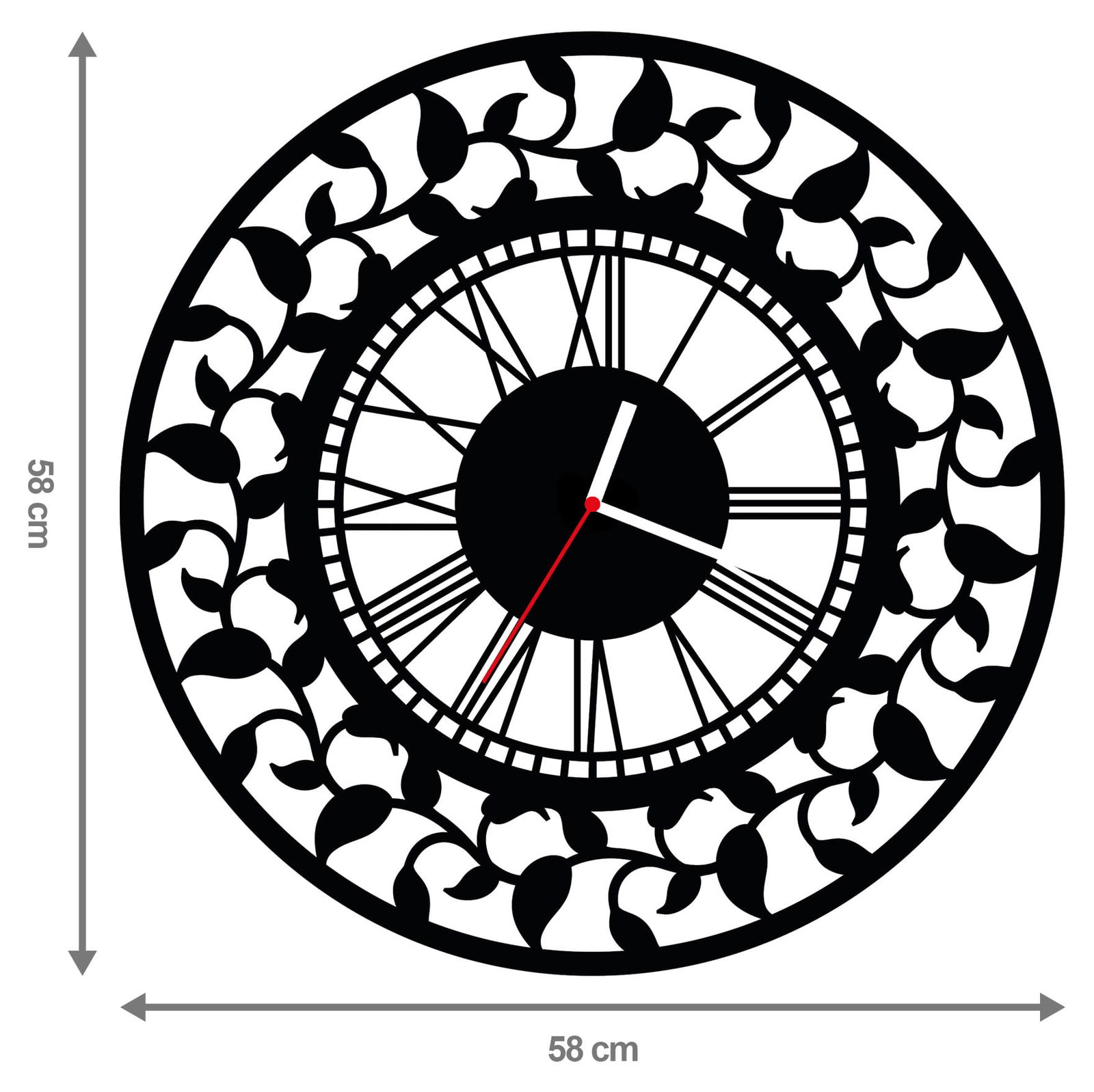 - DUŻA ŚREDNICA 58 cm – zegar posiada imponująco duży rozmiar, co sprawia, że będzie widoczny z daleka. Doskonale sprawdzi się zarówno w domu, biurze, szkole i innych większych pomieszczeniach.