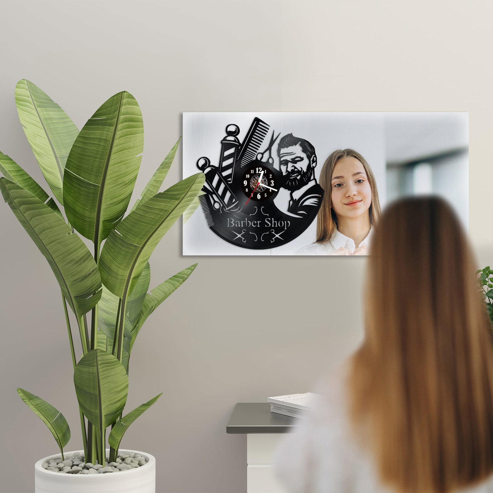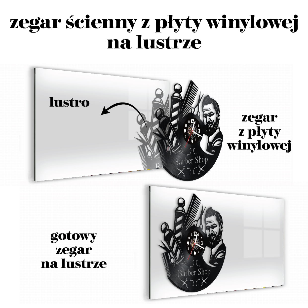 Zegar Ścienny z płyty winylowej na lustrze BARBER SHOP 10 wzorów 59x29cm (lustro) 28x28cm zegar winylowy