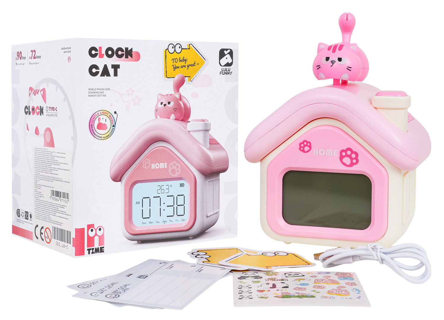 Elektroniczny zegar, budzik dla dzieci od trzeciego roku życia. Idealny jako budzik jak i dekoracja pokoju dziecięcego. Duża pojemność akumulatora i ładowanie kablem typu C. Subtelne oświetlenie nocne nie zakłóca snu w nocy. Zegar wyposażono we wskaźnik temperatury, minutnik, wskaźnik naładowania baterii, duży przejrzysty wyświetlacz, alarmy i tryb drzemki. Zegar idealnie sprawdzi się podczas nauki samodzielnego kładzenia się spać i wstawania. W zestawie mamy również karty, na których możemy wpisać plan dnia, kartki ze strzałkami, naklejki dekoracyjne i kabel do ładowania typu C. Zegar zasilany jest akumulatorem typu 3,7 V 1200 mAh (w zestawie). W instrukcji znajduje się kod do aplikacji umożliwiającej pobranie różnych dzwonków.
