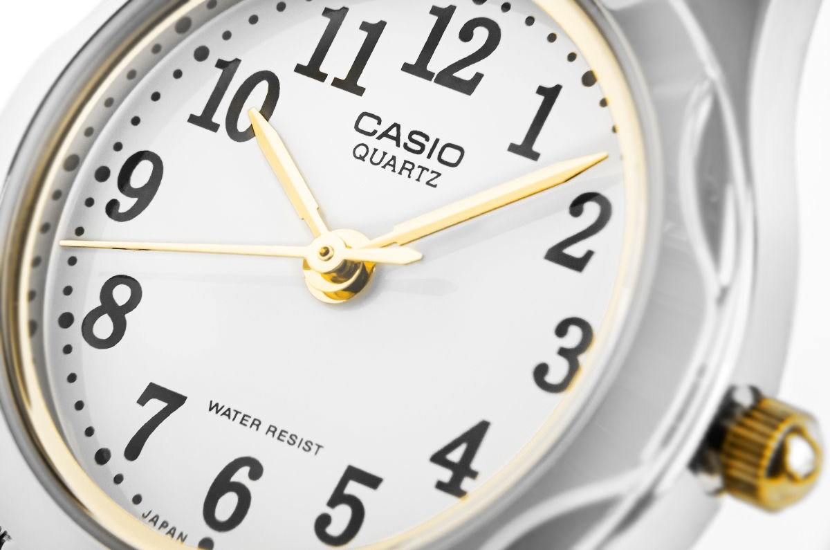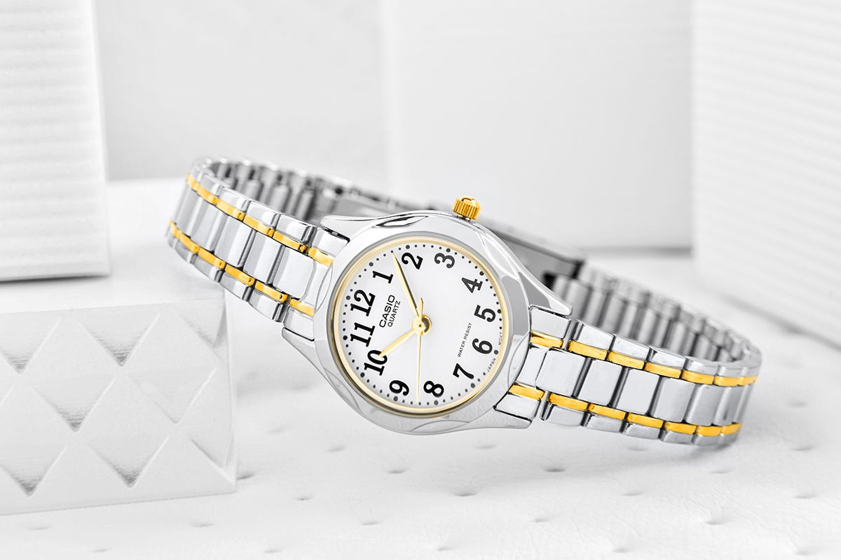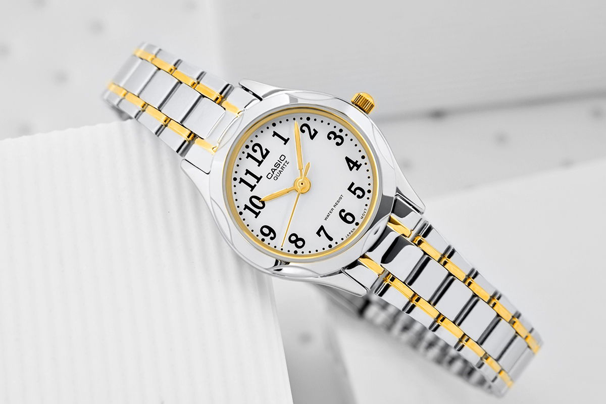 Śnieżnobiała tarcza z wyraźnymi, czarnymi cyframi to połączenie minimalizmu i elegancji, które sprawia, że zegarek jest niezwykle czytelny i funkcjonalny. Złote wskazówki oraz subtelne detale nadają mu szlachetnego charakteru, a lśniąca srebrno-złota bransoleta dodaje biżuteryjnego uroku, pięknie komponując się z każdym stylem. Smukła koperta, o subtelnie zaokrąglonych krawędziach, idealnie dopasowuje się do kobiecego nadgarstka, podkreślając jego delikatność i wdzięk. Każdy detal tego zegarka marki CASIO został zaprojektowany z myślą o kobiecej delikatności i klasycznym pięknie.