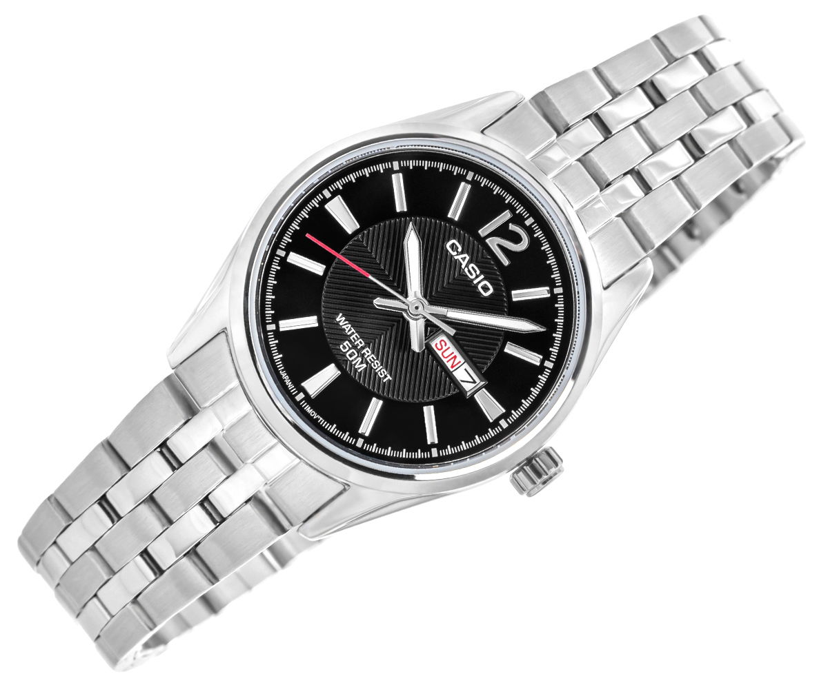 Damski zegarek CASIO LTP-1335D-1AVDF to esencja ponadczasowego stylu w nowoczesnej odsłonie – z głęboko czarną tarczą, która przyciąga spojrzenie spokojem, prostotą i siłą wyrazu. Minimalistyczna, ciemna tarcza tworzy piękny kontrast ze srebrną bransoletą o lśniącym wykończeniu, oplatającą nadgarstek niczym subtelna biżuteria. To klasyka, która nie potrzebuje ozdobników – wystarczy jeden detal, by wyrazić wszystko. Dyskretna funkcja datownika z dniem tygodnia na godzinie 3. dba o Twój codzienny rytm, a wodoodporność do 50 metrów daje Ci swobodę – bez względu na pogodę czy plan dnia. Ten zegarek jest subtelny, a jednocześnie zdecydowany. Świetnie odnajdzie się przy białej koszuli, czarnej marynarce, lekkiej sukience czy jeansach – bo to Ty jesteś jego dopełnieniem.