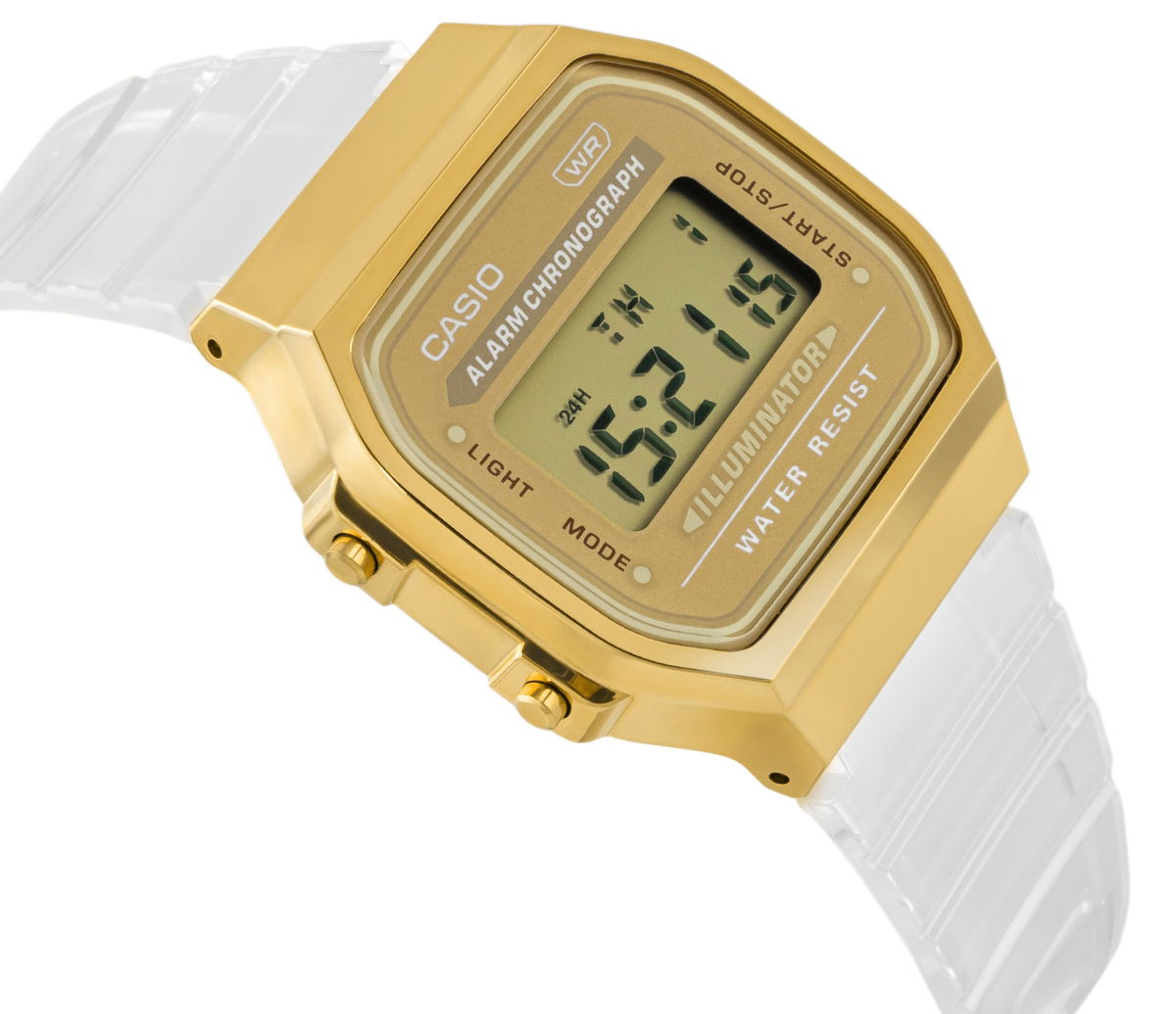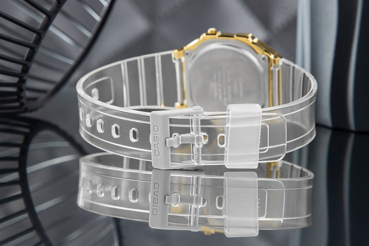 Model CASIO A168XESG to subtelny błysk złota, lekkość transparentnego paska i ponadczasowy kształt – czyli minimalizm z charakterem. Dla kobiet, które lubią styl z duszą i cenią dodatki, które opowiadają historię.