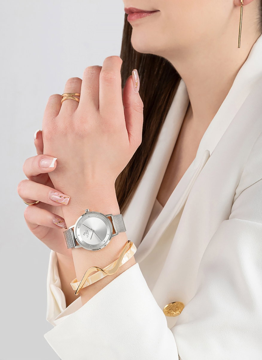 Delikatna bransoleta typu mesh wykonana z precyzyjnie splecionych metalowych włókien tworzy elegancki element, który przyciąga uwagę swoją lekkością. Jej drobna struktura sprawia, że idealnie dopasowuje się do nadgarstka, układając się miękko i naturalnie. Gładka w dotyku, finezyjna i niezwykle komfortowa, przypomina biżuterię stworzoną z myślą o codziennym noszeniu. Subtelny splot nadaje zegarkowi wizualnej lekkości, nie odbierając mu jednocześnie poczucia solidności. Dzięki swojej uniwersalnej formie bransoleta doskonale współgra zarówno z minimalistycznymi, jak i bardziej eleganckimi stylizacjami.