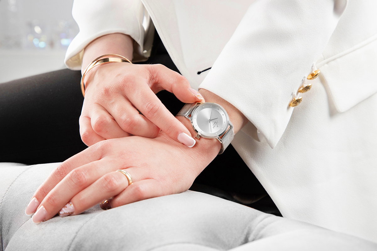 To czasomierz o wyraźnie biżuteryjnym charakterze, w którym minimalizm spotyka się z subtelnym blaskiem. Delikatny, nowoczesny i pełen klasy — idealny jako dyskretny akcent, który podkreśla styl bez potrzeby zbędnych ozdobników.