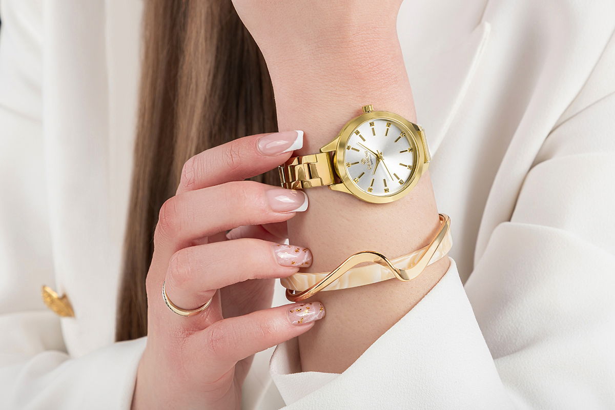 Całość osadzono na delikatnej bransolecie, która miękko układa się na nadgarstku, zapewniając komfort noszenia i naturalne dopasowanie. Subtelna konstrukcja bransolety podkreśla lekkość zegarka i sprawia, że staje się on niemal biżuteryjną ozdobą, idealną na każdą porę dnia.