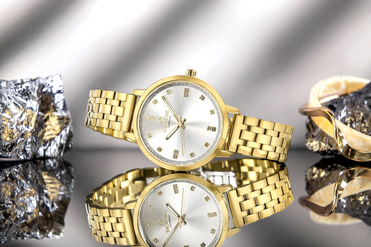 Na tarczy zastosowano indeksy łączące złote detale z cyrkoniami, które delikatnie rozświetlają kompozycję i nadają jej szlachetnego blasku. Kamienie zostały rozmieszczone w sposób wyważony, dzięki czemu pełnią rolę eleganckiej ozdoby, nie zakłócając czytelności czasu. Efekt ten sprawia, że zegarek przyciąga uwagę subtelnością, a nie intensywnością.