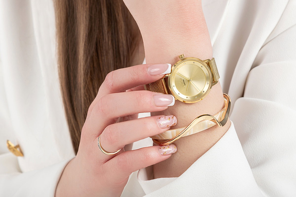 To czasomierz o wyraźnie biżuteryjnym charakterze, w którym minimalizm spotyka się z subtelnym blaskiem. Delikatny, nowoczesny i pełen klasy — idealny jako dyskretny akcent, który podkreśla styl bez potrzeby zbędnych ozdobników.