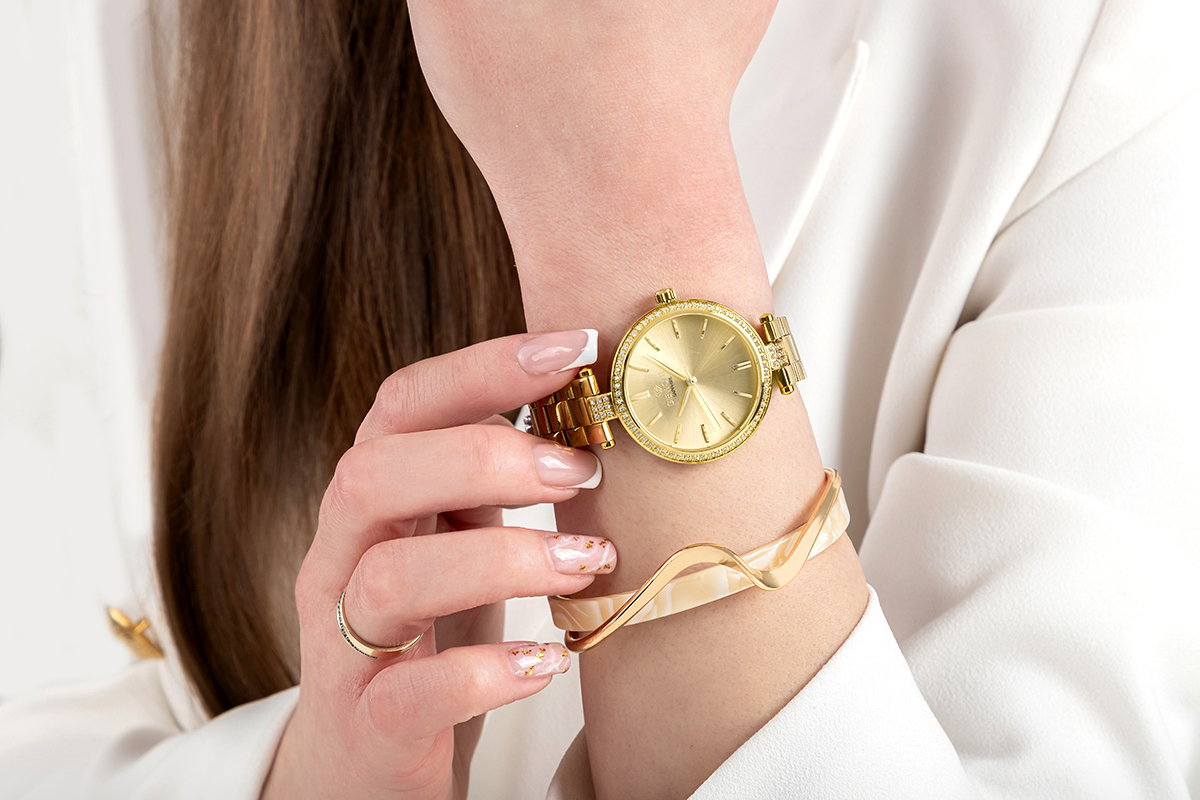 Koperta została ozdobiona cyrkoniami, które delikatnie podkreślają jej linię i nadają zegarkowi luksusowego blasku. Dodatkowe cyrkonie umieszczone przy połączeniu koperty z bransoletą tworzą subtelny, jubilerski akcent, który pięknie dopełnia całą konstrukcję. To detale, które budują charakter precyzyjnie zaprojektowanej biżuterii.