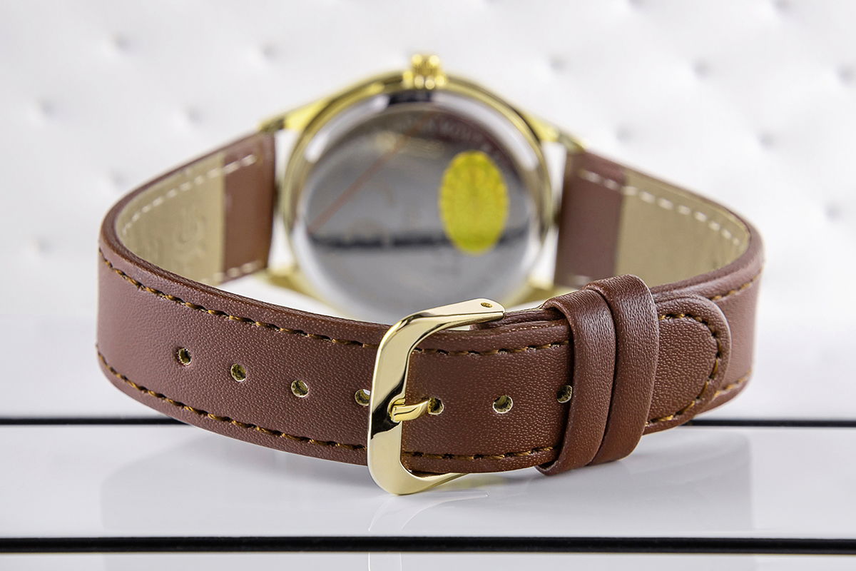 Ten zegarek to idealne połączenie luksusu z ciepłem i naturalnością. Złota koperta subtelnie otula białą tarczę, dodając elegancji i blasku. Czarne indeksy oraz wskazówki tworzą efektowny kontrast, zapewniając doskonałą czytelność. Czarni sekundnik dodaje dynamiki, płynnie poruszając się w rytmie czasu.