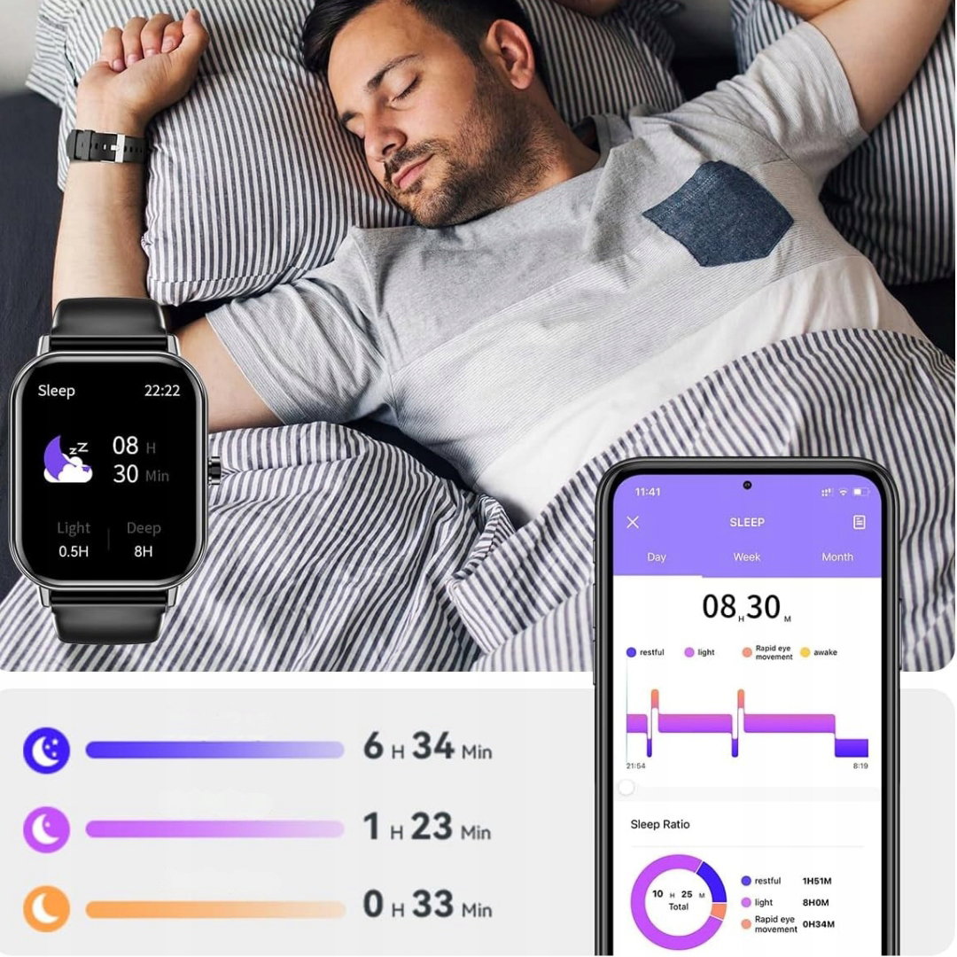 - Monitorowanie zdrowia: zegarek fitness wyposażony w zaawansowane czujniki, które w czasie rzeczywistym monitorują tętno oraz poziom stresu przez cały dzień. Automatycznie analizuje wzorce snu, oferując szczegółową ocenę jakości snu (głęboki/płytki sen). Aby zapewnić optymalną wydajność, ważne jest, aby zegarek z czujnikiem tętna był noszony odpowiednio – nie za ciasno, ani za luźno, co pozwala skórze oddychać i zapewnia dokładność pomiarów.
