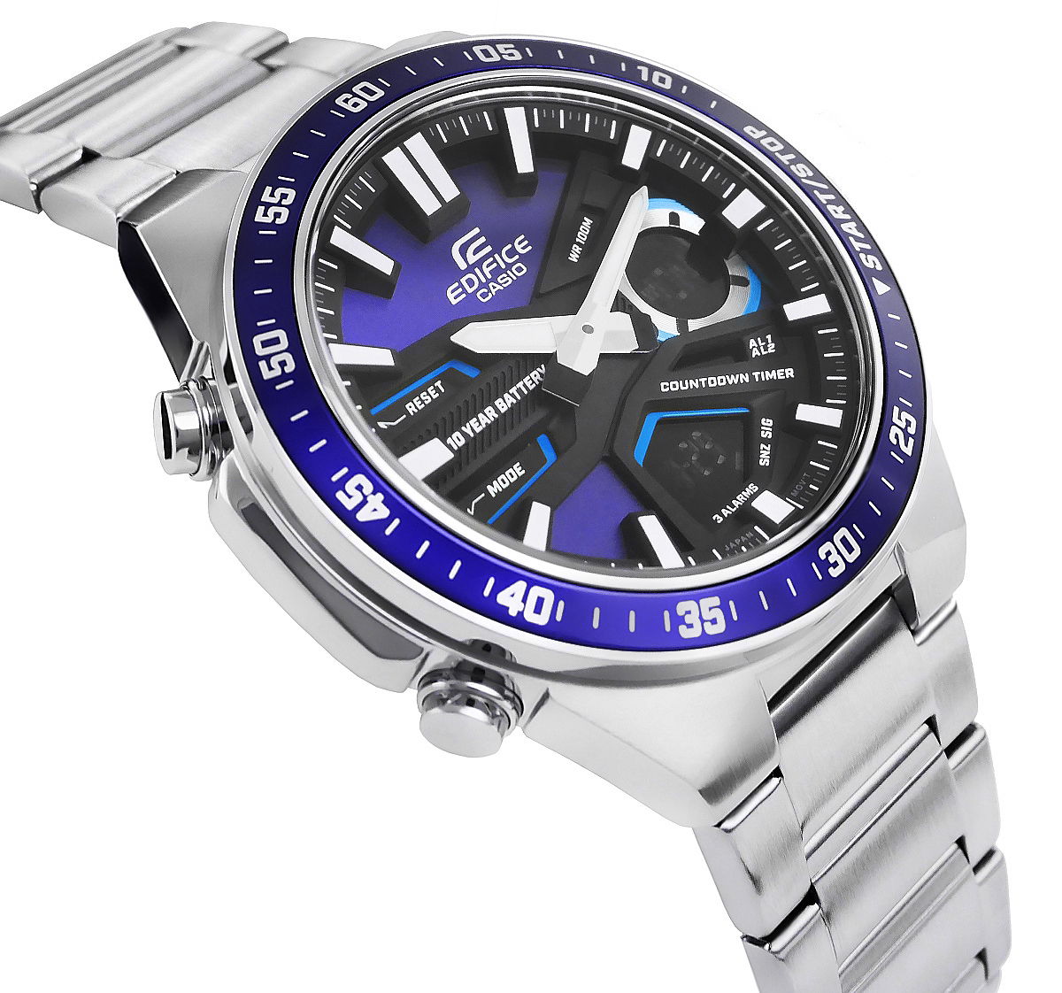 Wszechstronny zegarek dla aktywnych i wymagających. Analogowo-cyfrowy czasomierz EDIFICE EFV-C110 zapewnia precyzję i funkcjonalność na lata – 10-letnia bateria sprawia, że możesz zapomnieć o jej wymianie na długi czas. Dynamiczny, sportowy design podkreśla głębia i trójwymiarowość tarczy, a cyfrowe wyświetlacze oferują szeroki wachlarz funkcji, w tym czas światowy, stoper 1/100 sekundy i minutnik odliczający. Model posiada również Telememo z możliwością zapisania 30 numerów telefonów, zawierających do 12 cyfr z nazwą do 8 znaków. Skup się na życiu i wybierz EDIFICE EFV-C110 - zegarek, który Cię nie zawiedzie.