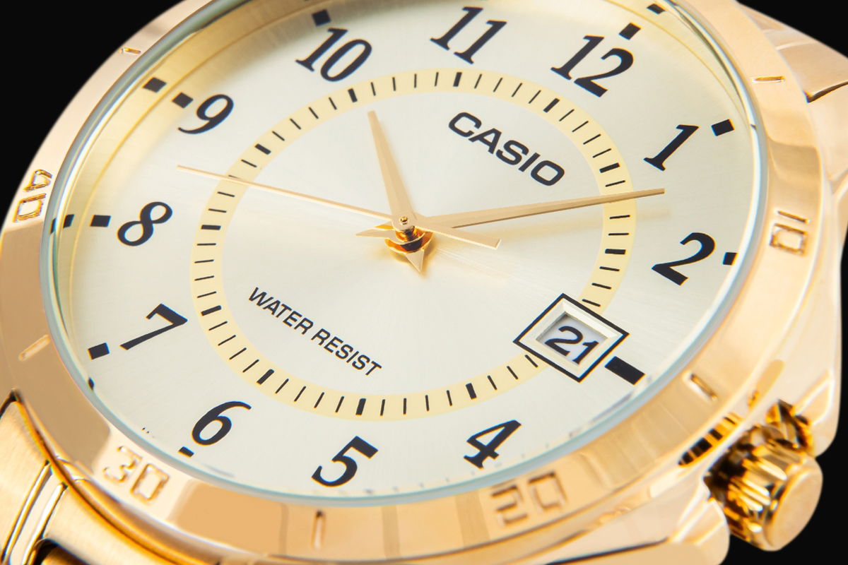 Męski model z kolekcji CASIO, wyróżniający się klasyczną 40-milimetrową kopertą oraz bransoletą ze stali nierdzewnej, pokrytymi trwałą powłoką jonową w kolorze złota. Jasna tarcza z wyraźnymi, czarnymi cyframi arabskimi zapewnia doskonałą czytelność, a dodatkowa skala minutowa w wewnętrznym pierścieniu ułatwia orientację w czasie. Praktyczny datownik zlokalizowany przy godzinie 3 umożliwia szybki wgląd w aktualny dzień miesiąca. Wodoodporność na poziomie WR (Water Resist) sprawia, że zegarek bez obaw można nosić na co dzień – np. podczas mycia rąk czy w deszczową pogodę. Zegarek napędzany jest precyzyjnym mechanizmem kwarcowym, gwarantującym niezawodne działanie.