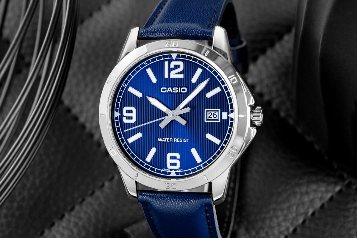 Zegarek Męski CASIO MTP-V004L-2BUDF + BOXWybierz sportową elegancję z klasycznym zegarkiem analogowym CASIO wyposażonym w minutową podziałkę na pierścieniu. Tarcza zegarka przyciąga wzrok intensywnym, głębokim odcieniem niebieskiego, wzbogaconym o subtelną strukturę pionowych prążków. Ten teksturalny efekt nie tylko dodaje elegancji, ale także sprawia, że światło odbija się od powierzchni w sposób dynamiczny, tworząc wrażenie głębi. Wyraziste indeksy, datownik i klasyczny skórzany pasek dopełniają całości, łącząc funkcjonalność z męskim stylem. Podziałka minutowa na bezelu dodaje dynamicznego charakteru i sprawdzi się w codziennym odmierzaniu czasu. Dodatkowym atutem jest wodoodporność (WR), dzięki której nie musisz martwić się o kontakt z deszczem czy wodą podczas codziennych czynności.