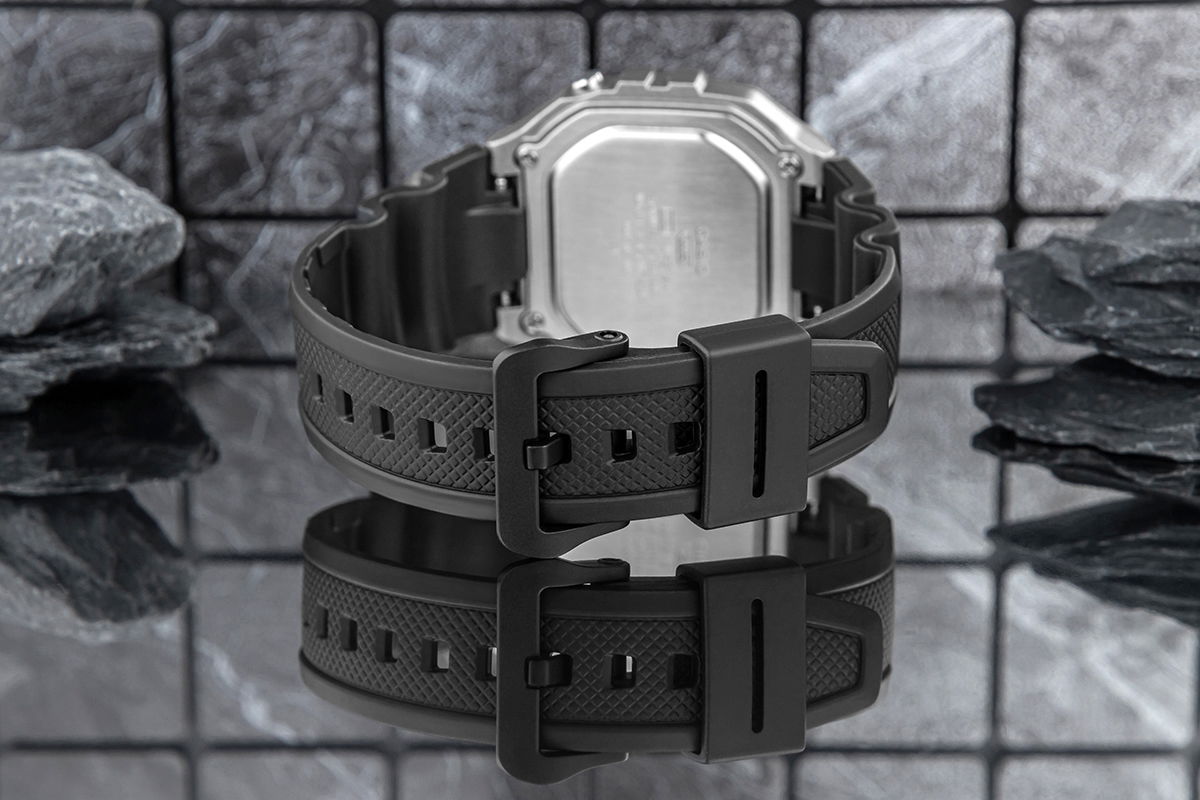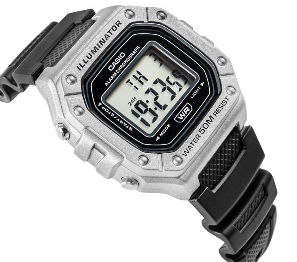 Casio W-218HM-7AVDF to esencja klasycznego stylu Casio w nowoczesnym, sportowym wydaniu: wyrazisty, prostokątny wyświetlacz LCD w solidnej kopercie, czytelny na pierwszy rzut oka, z subtelnymi akcentami, które dodają mu świeżości i uniwersalności. Zegarek został stworzony do codziennego tempa: wodoszczelność 50 m, podświetlenie LED dla pewnego odczytu po zmroku, 7-letnia bateria dla długiej niezawodności, a także praktyczny zestaw funkcji – stoper 1/100 s (do 60 min), alarm dzienny i sygnał pełnej godziny, automatyczny kalendarz oraz format 12/24 h. Lekki i wygodny, z szkiełkiem z tworzywa (Resin Glass) i wytrzymałym paskiem z żywicy, świetnie sprawdzi się zarówno na treningu, jak i w codziennych stylizacjach. Jeśli szukasz bezkompromisowej prostoty połączonej z legendarną trwałością Casio, W-218HM-7AVDF będzie strzałem w dziesiątkę.