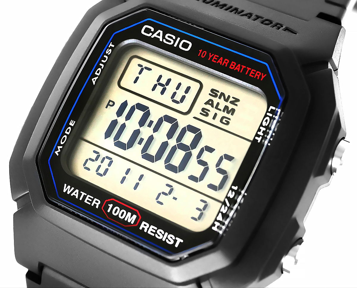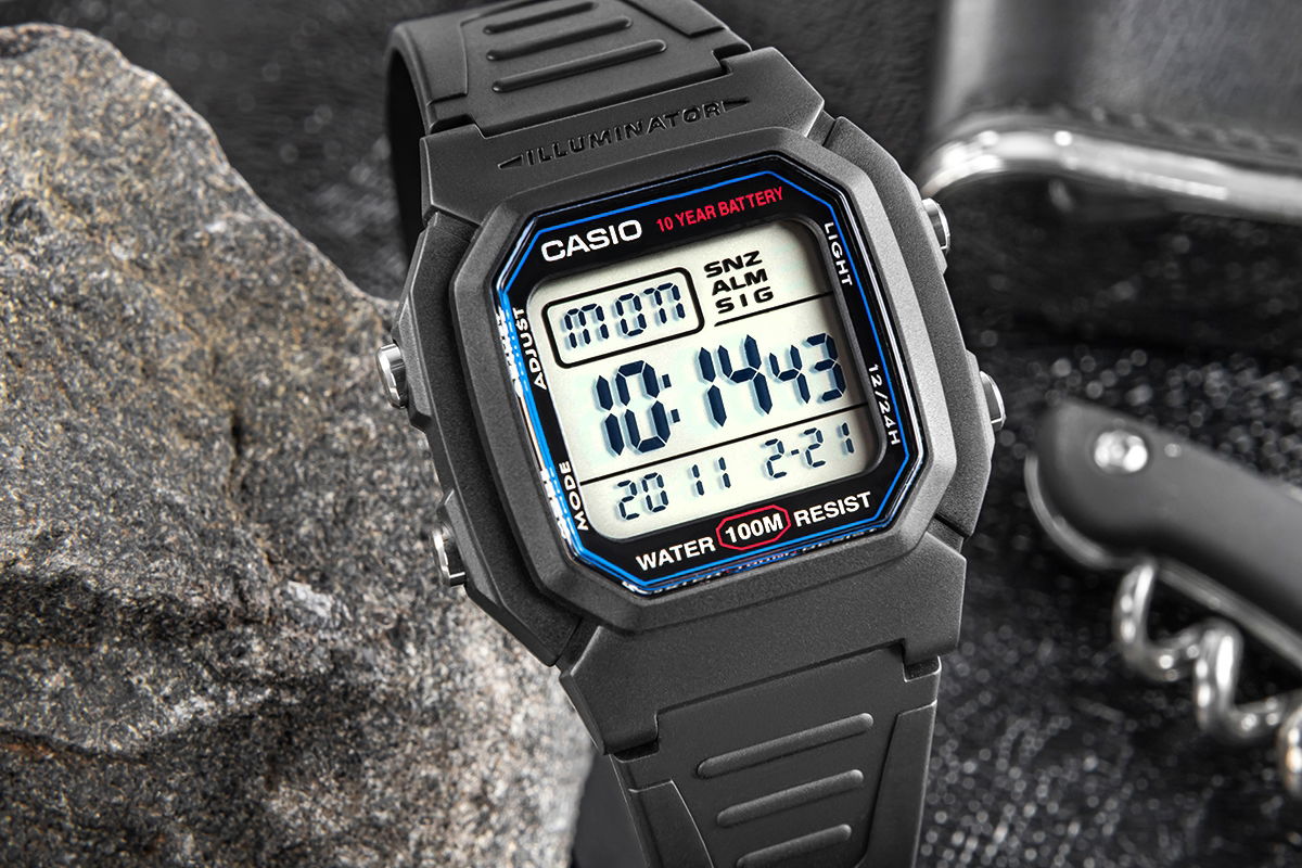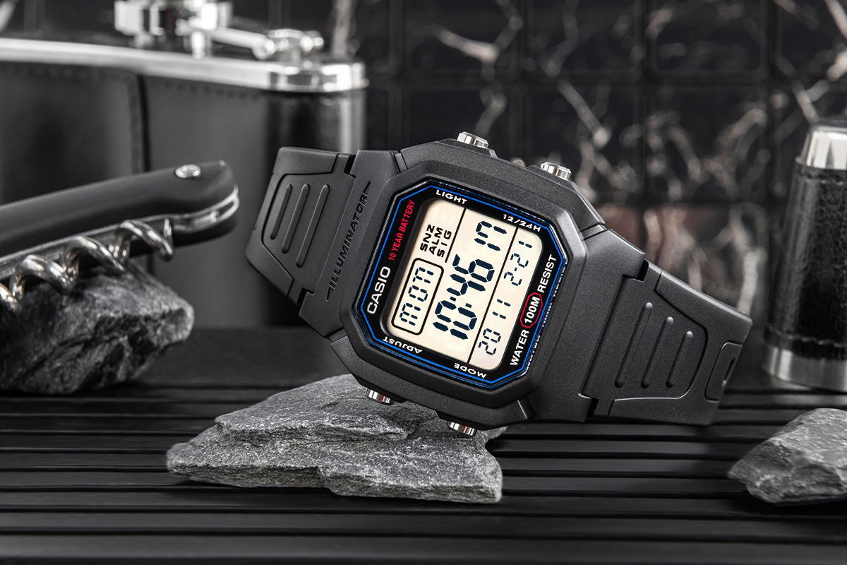 Zegarek Męski Casio W-800H to niezawodność w czytelniej formie - nowoczesny zegarek cyfrowy z dużym wyświetlaczem, który umożliwia szybki i łatwy odczyt godziny. Wyposażony w wodoszczelność do 100 metrów, baterię o żywotności 10 lat, podświetlenie LED oraz inne funkcje. Zegarek oferuje wszystkie najważniejsze informacje - godzina, data i dzień tygodnia - w dużej czytelnej formie. Dzięki funkcjom takim jak stoper 1/100 sekundy, podwójny czas i alarm z drzemką, świetnie sprawdza się zarówno podczas treningów, jak i w podróży. Wytrzymałe podświetlenie LED z efektem poświaty zapewnia dobrą widoczność nawet po zmroku. Solidna konstrukcja zapewnia trwałość w miejskiej dżungli i podczas outdoorowych przygód.