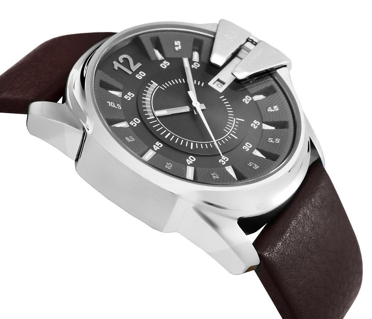 Kolorystyka Diesel DZ1206 to połączenie surowej elegancji i nowoczesnej funkcjonalności – wielowarstwowa tarcza w kolorze stalowym emanuje głębią i tajemniczością, a jej subtelne faktury nadają całości technicznego, precyzyjnego charakteru. Desing podkręcają szczotkowane, srebrne detale, które kontrastują z głęboką, promieniście szlifowaną powierzchnią wewnętrznego okręgu. Dominującym elementem tarczy jest duża, wyrazista liczba „12”, symbolizująca klarowność i siłę designu. Indeksy i cyfry na krawędziach rozmieszczono w stylu inspirowanym prędkościomierzami, podkreślając dynamiczny charakter modelu. Oryginalnym akcentem jest osłona koronki z wygrawerowanym logo Diesel, która nadaje zegarkowi wyrazistości i industrialnej surowości.