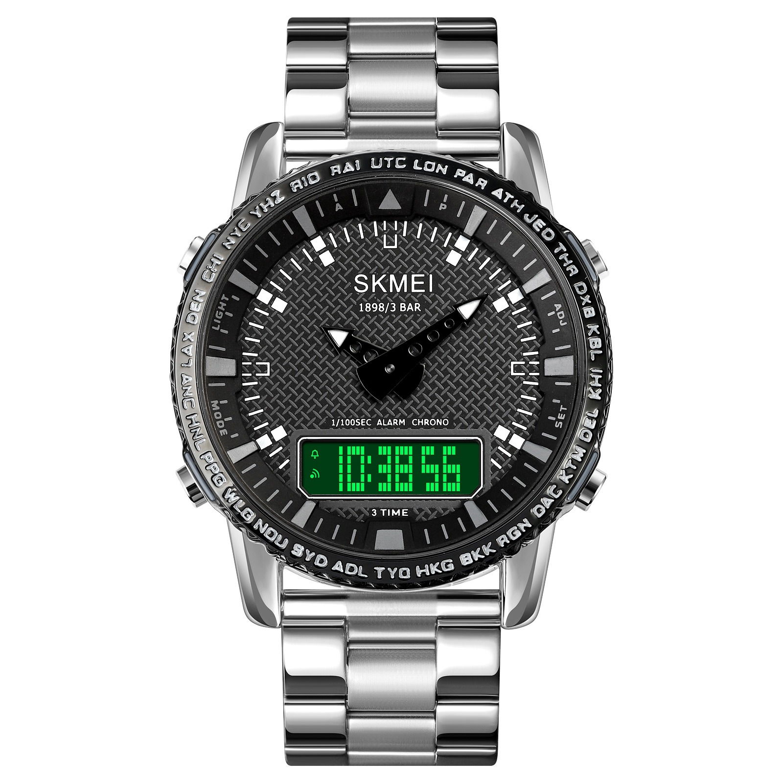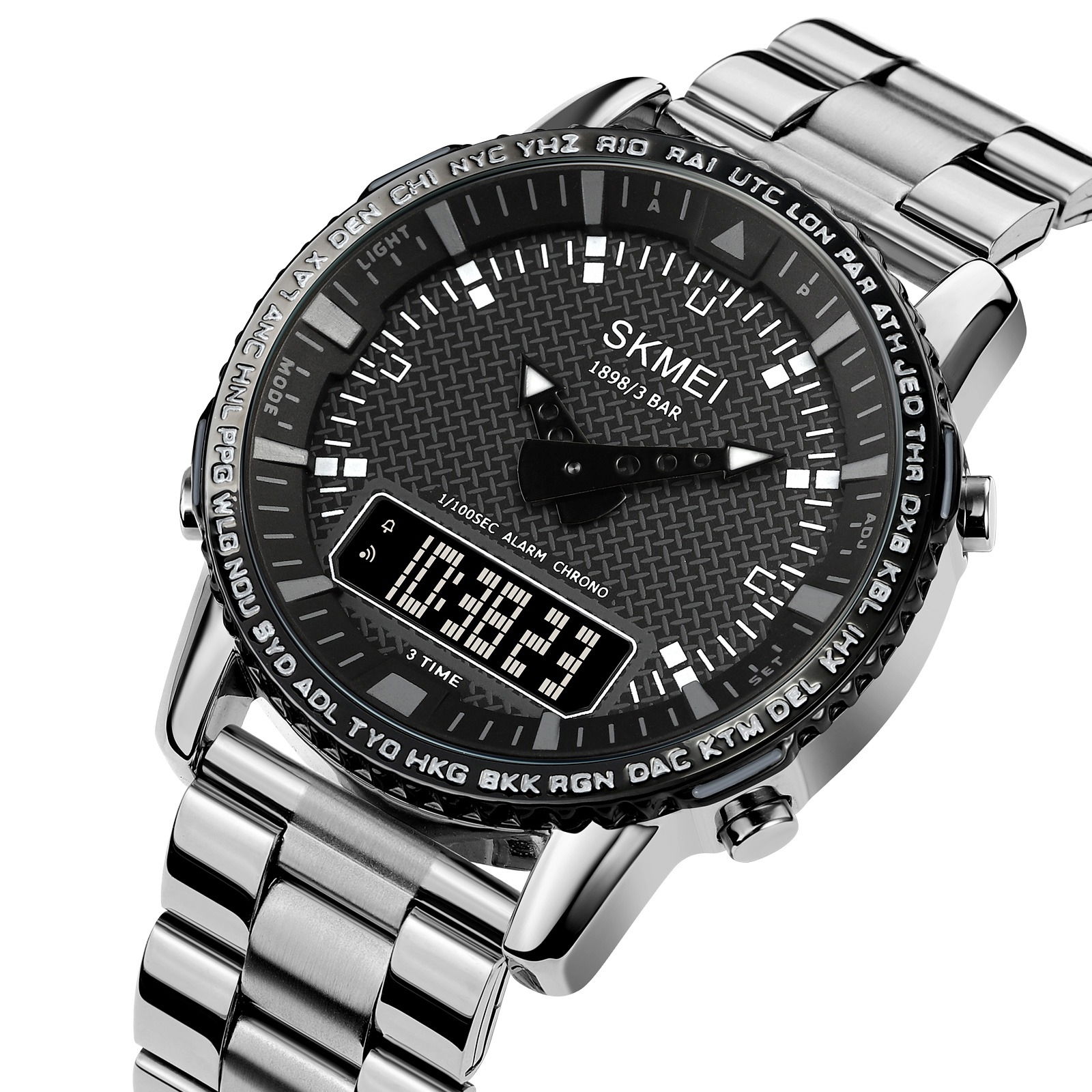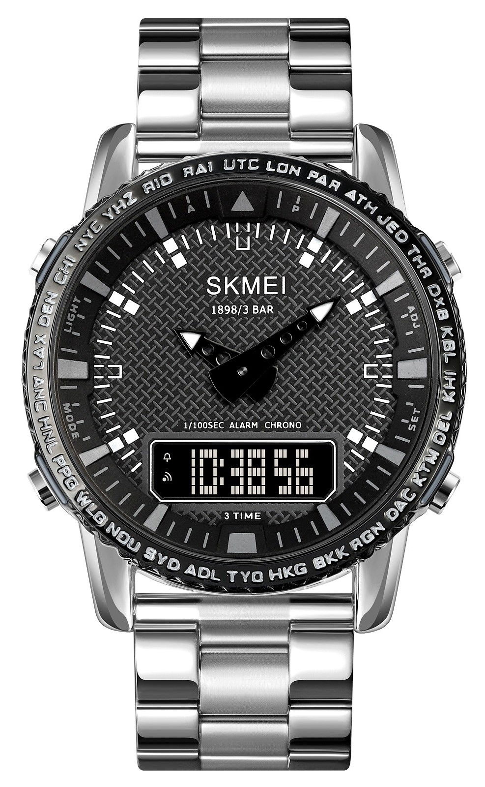 Zegarek Skmei 1898 ma wyjątkowe obramowanie tarczy, które wyróżnia się wygrawerowanymi skrótami miast i stref czasowych z całego świata. Skróty takie jak LON (Londyn), PAR (Paryż), NYC (Nowy Jork), HKG (Hongkong) czy SYD (Sydney) pozwalają użytkownikowi szybko orientować się w różnych strefach czasowych, co jest przydatne dla mężczyzny, który podróżuje lub zarządza czasem na poziomie międzynarodowym. To nie tylko funkcjonalny detal, ale także designerski akcent, który dodaje zegarkowi globalnego, profesjonalnego charakteru.