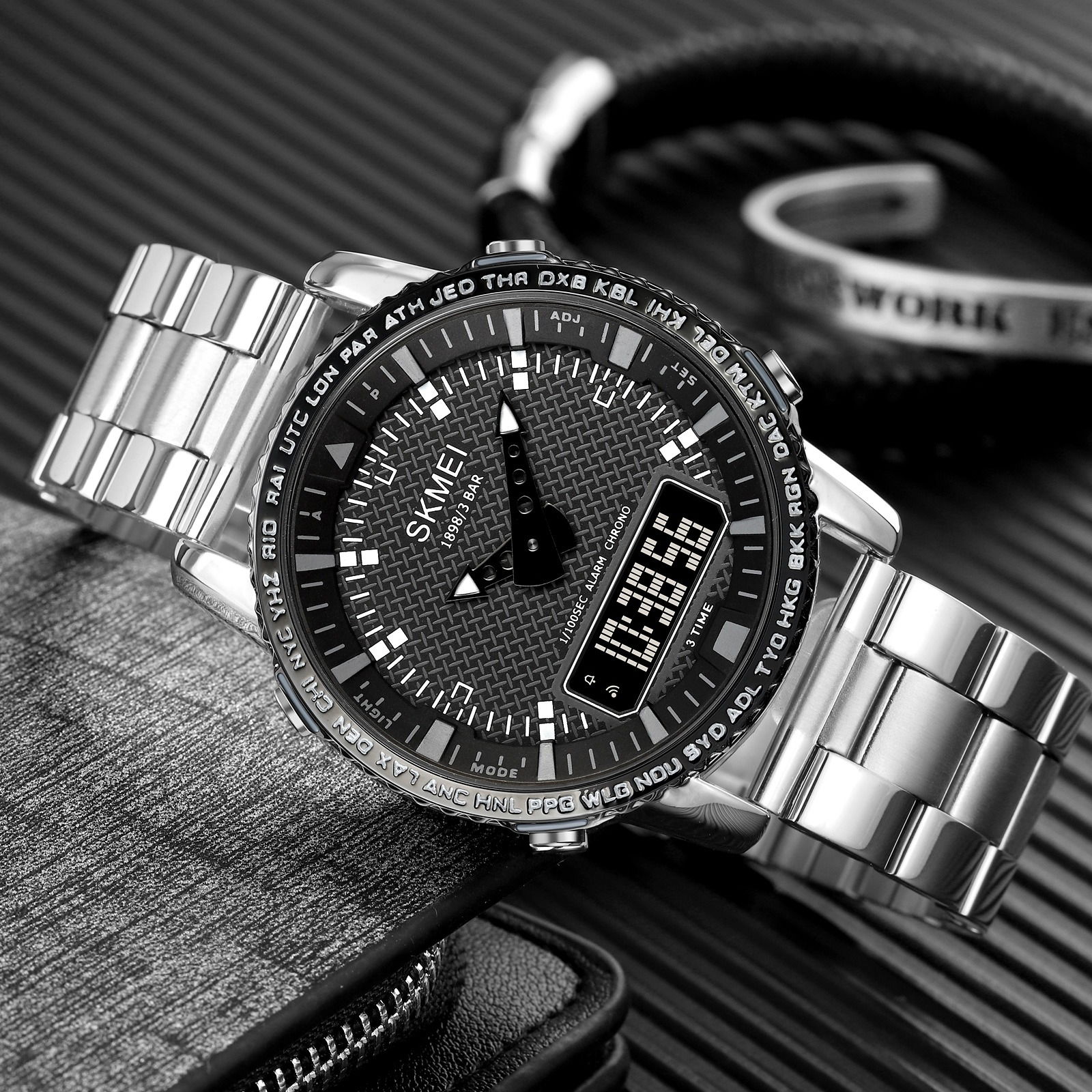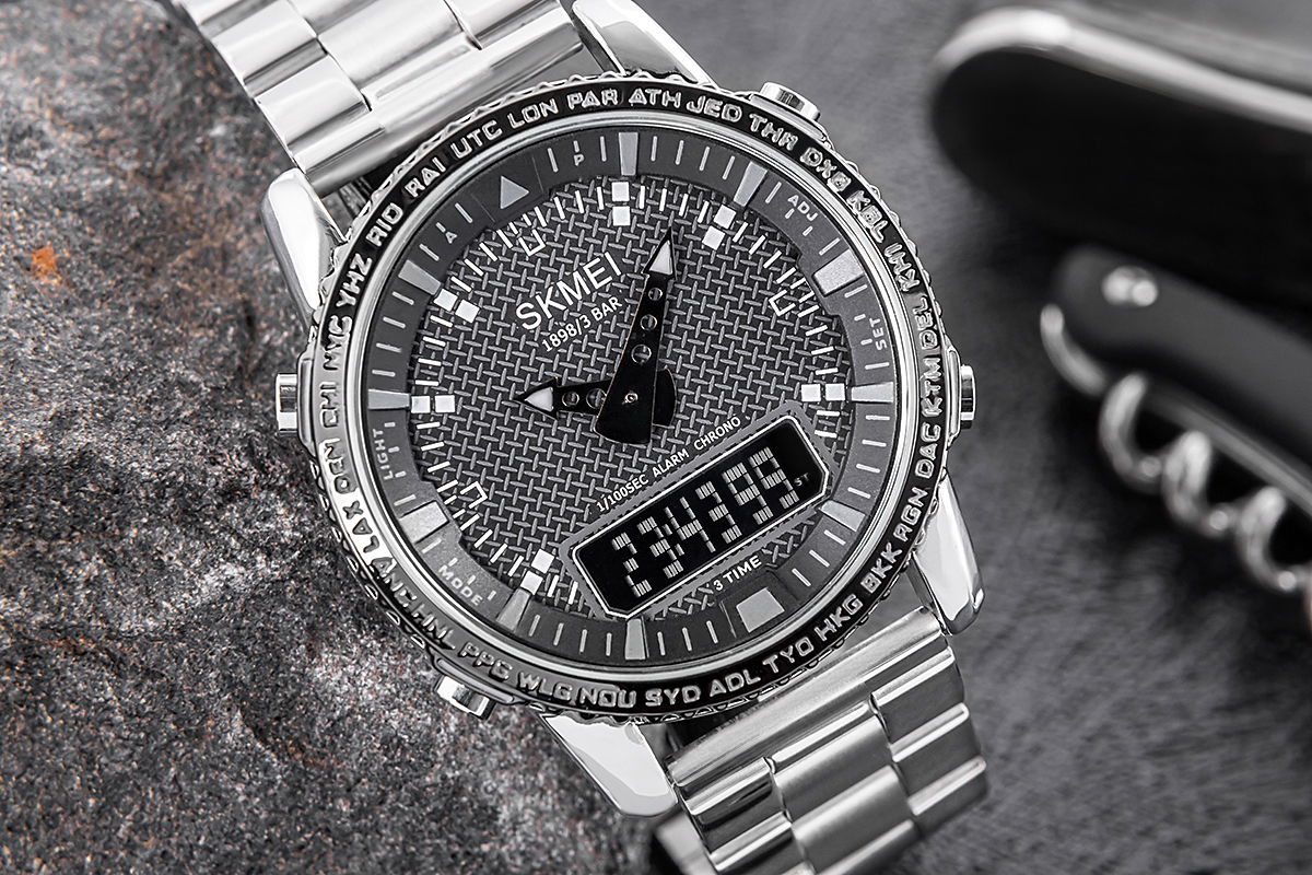Zegarek Skmei to prawdziwe narzędzie do zarządzania męskim czasem – funkcjonalny i niezawodny, zaprojektowany z myślą o mężczyźnie, który potrzebuje czegoś więcej niż tylko wskazania godziny. Teksturowana tarcza nadaje mu głębi i surowego, męskiego charakteru, wyróżniając go spośród typowych, gładkich modeli.Obramowanie z wygrawerowanymi skrótami miast i stref czasowych, takich jak NYC, LON, czy SYD, podkreśla jego globalny styl i przydatność dla mężczyzny, który żyje i działa na poziomie międzynarodowym.