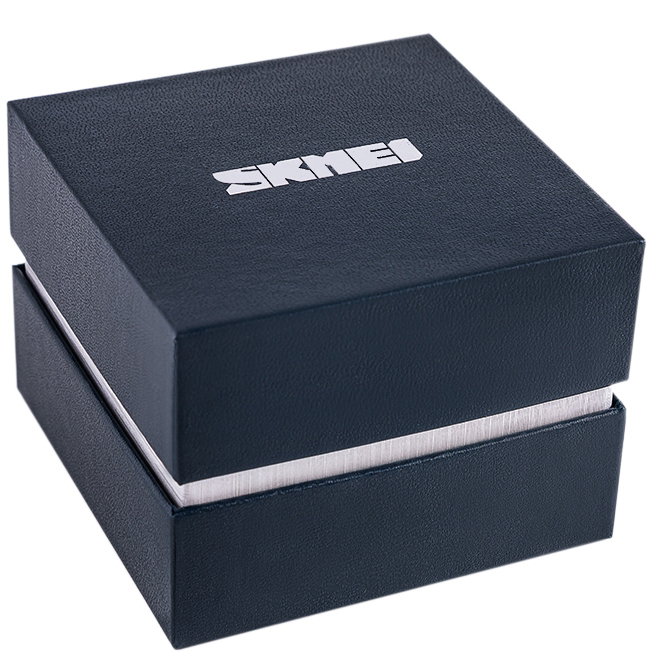 Do każdego zegarka marki Skmei dołączamy stylowe pudełko, które jest idealnym uzupełnieniem zestawu. Granatowe pudełko z subtelnym logo Skmei nie tylko chroni czasomierz, ale także dodaje mu wyjątkowego charakteru. Wnętrze pudełka wyściełane jest miękką poduszką, która bezpiecznie podtrzymuje zegarek, podkreślając jego detale i zapewniając mu elegancką prezentację.