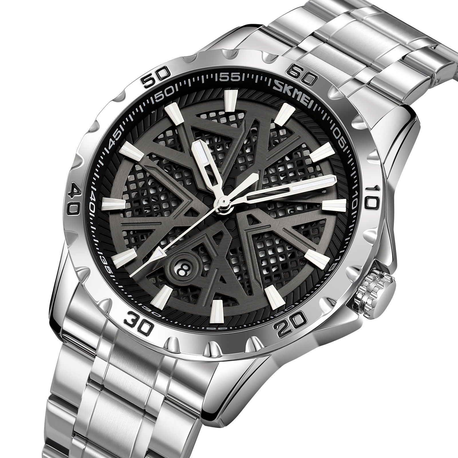 Zegarek Skmei 9337 to czysta, męska elegancja z pazurem – przyciąga uwagę wyrazistą, ale zarazem subtelną kolorystyką. Srebrna koperta i bransoleta tworzą solidną, klasyczną podstawę, która idealnie kontrastuje z trójwymiarową tarczą w odcieniach stalowej szarości. Taka tarcza z elementami 3D dodaje głębi i charakteru, a srebrne, fluorescencyjne indeksy i wskazówki sprawiają, że zegarek pozostaje czytelny o każdej porze.