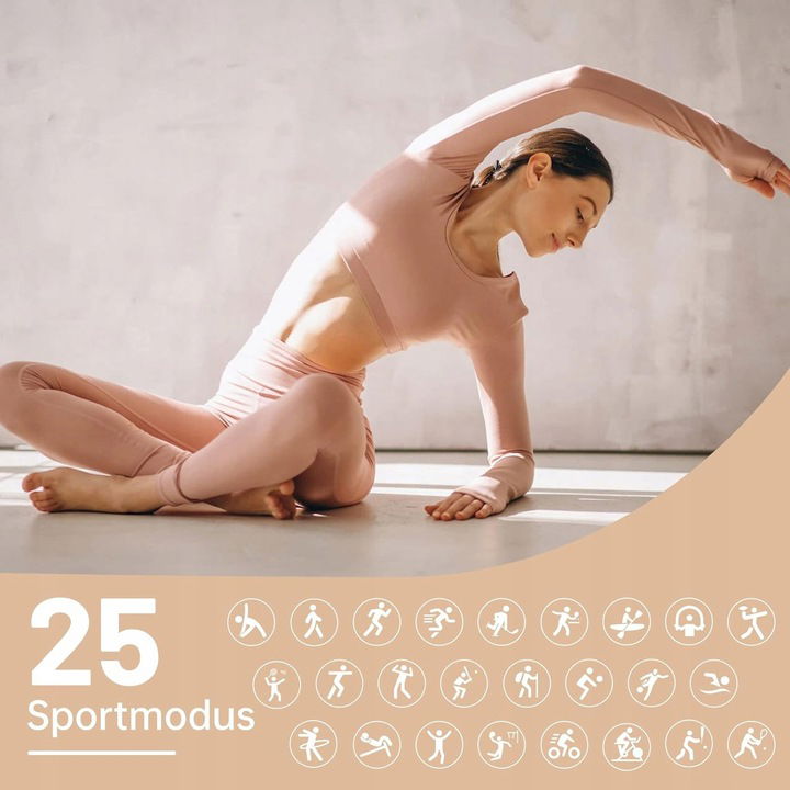 [25 trybów sportowych tracker aktywności] Ten monitor aktywności dla kobiet i mężczyzn może bezpośrednio wprowadzić 25 trybów sportowych, takich jak chodzenie, bieganie, jazda na rowerze, siatkówka, bieżnia, pływanie, piłka nożna, badminton, koszykówka, skakanie, joga, taniec, hokej na boisku, cycling, wiosłowanie łodzi itd. Smartwatch może również dokładnie rejestrować kroki, kalorie, odległość, tętno i rozpoznawać stan aktywności w czasie rzeczywistym.