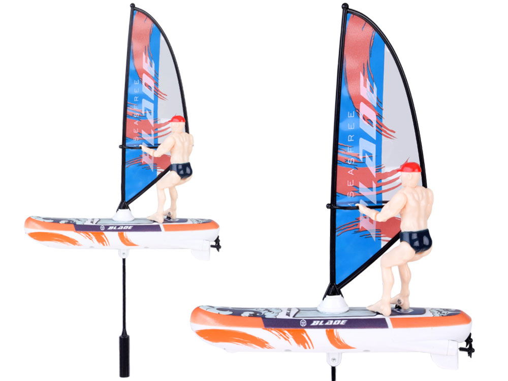 Pilot zdalnego sterowania umożliwia płynną kontrolę żaglówką przód-tył oraz prawo-lewo za pomocą joysticka, a tryb żeglarski pozwala postaci na żaglówce poruszać się na boki. Wodoodporna konstrukcja gwarantuje długotrwałą zabawę na wodzie, a kompaktowe wymiary sprawiają, że windsurfer jest idealny do użytku na basenie, jeziorze czy nawet w wannie.