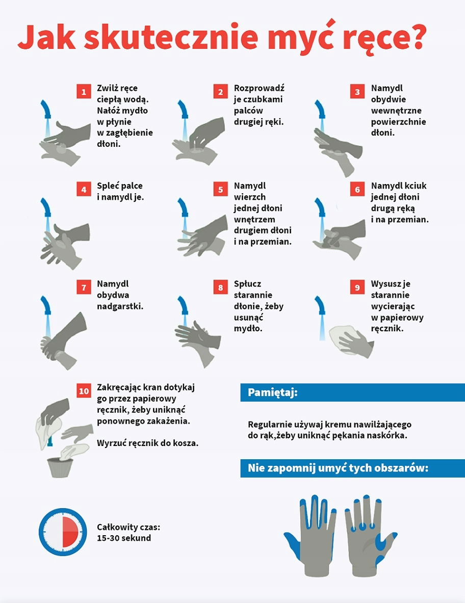 - Myj ręce wodą z mydłem albo dezynfekuj preparatem na bazie alkoholu