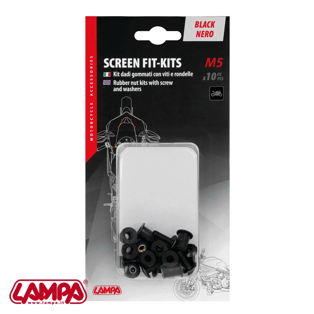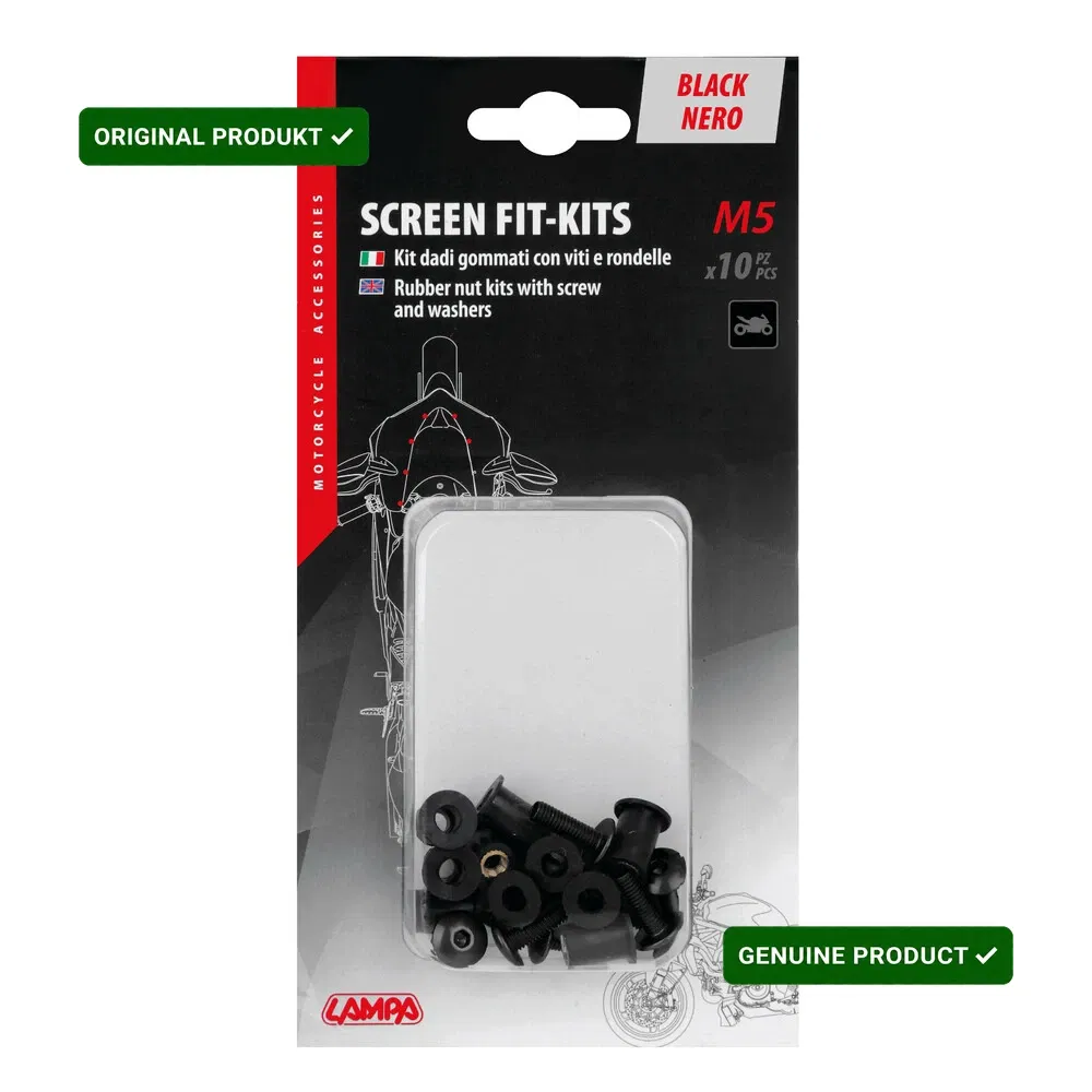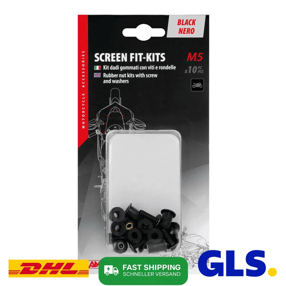 KOD/Nazwa: 91651 Śrubki M5 do owiewek i szyb motocyklowych, gumowe nakrętki samoblokujące ze śrubkami i podkładkami – 10 sztuk – kolor czarny
