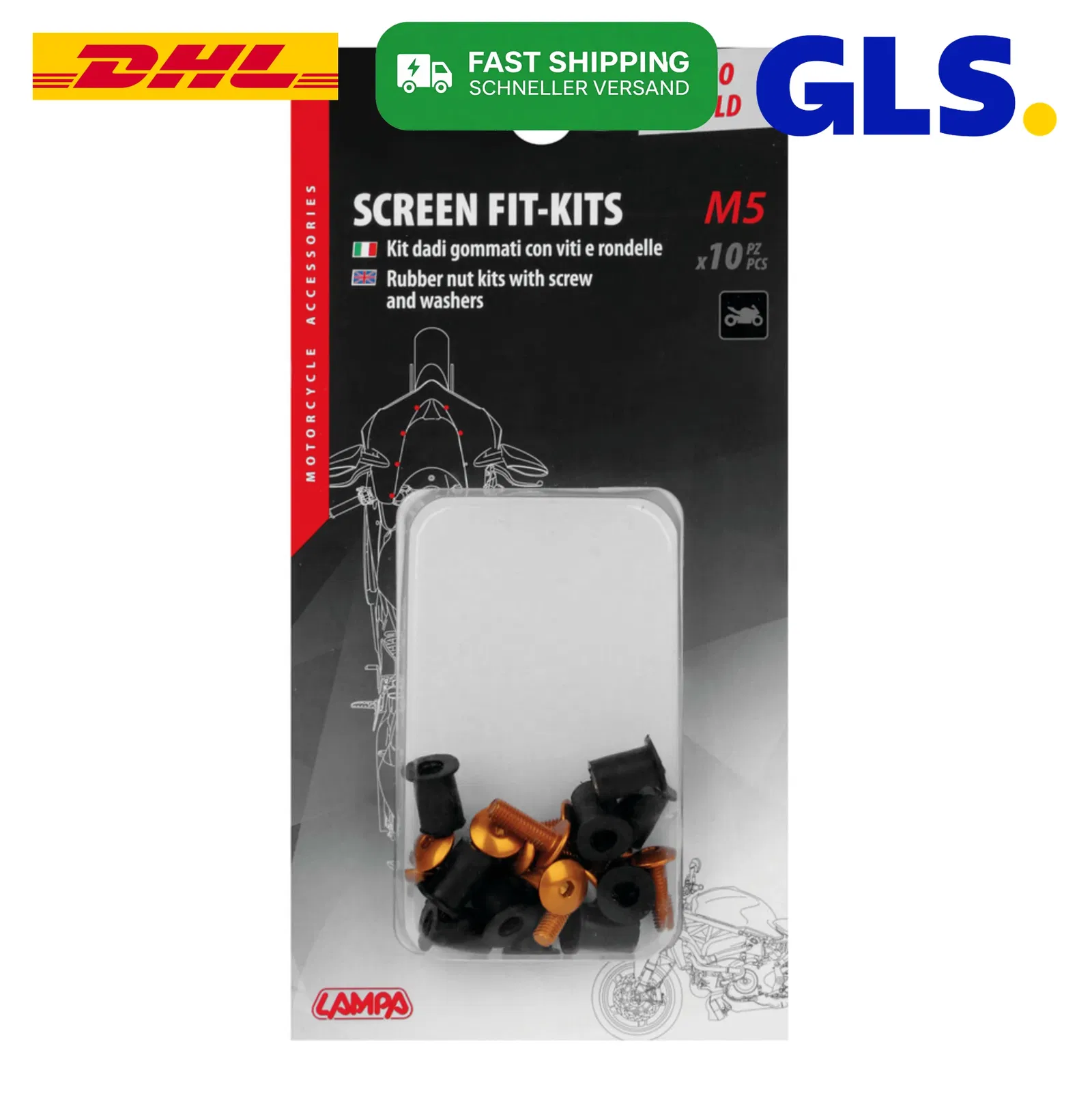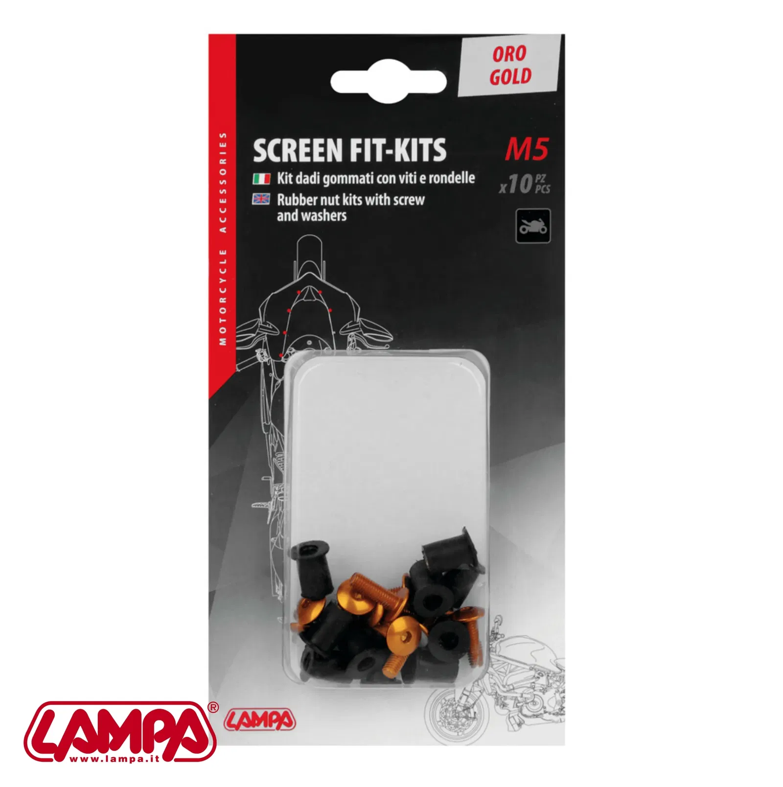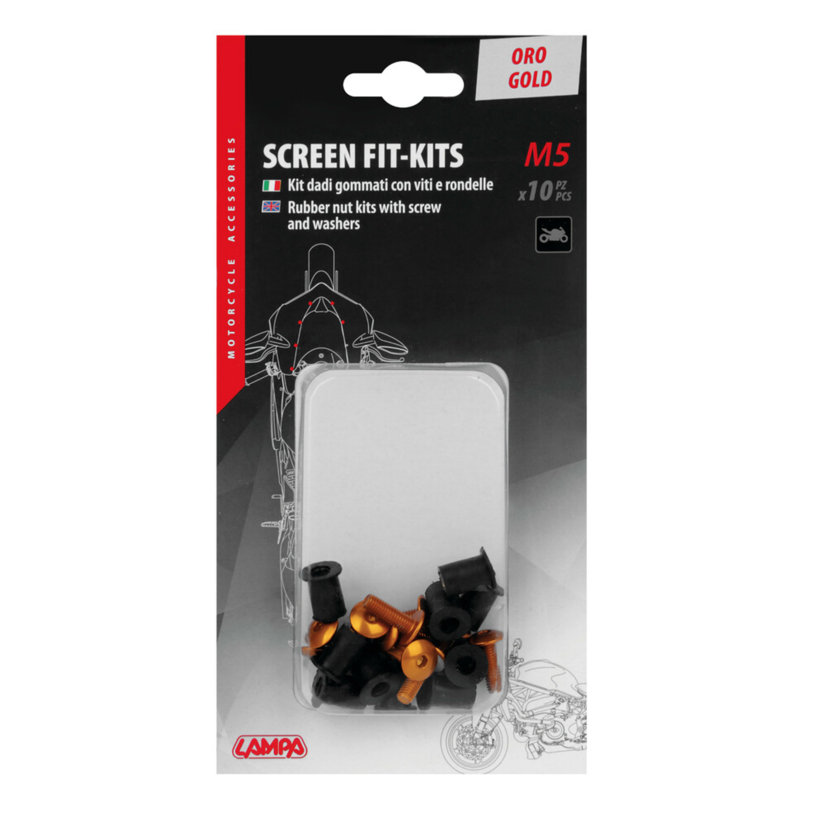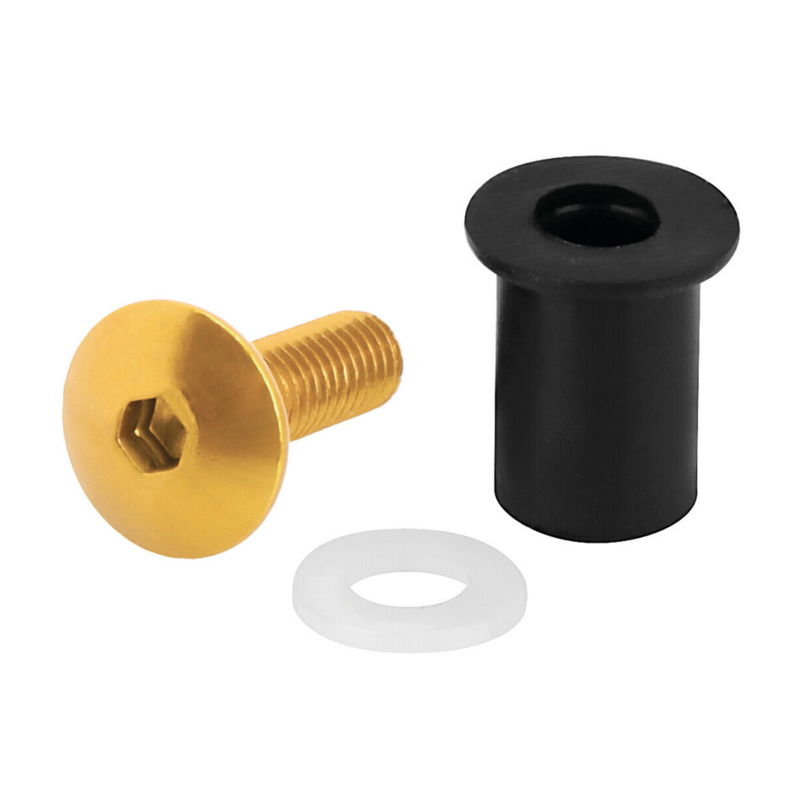 KOD/Nazwa: 91652 Śrubki M5 do owiewek i szyb motocyklowych, gumowe nakrętki samoblokujące ze śrubkami i podkładkami – 10 sztuk – kolor złoty