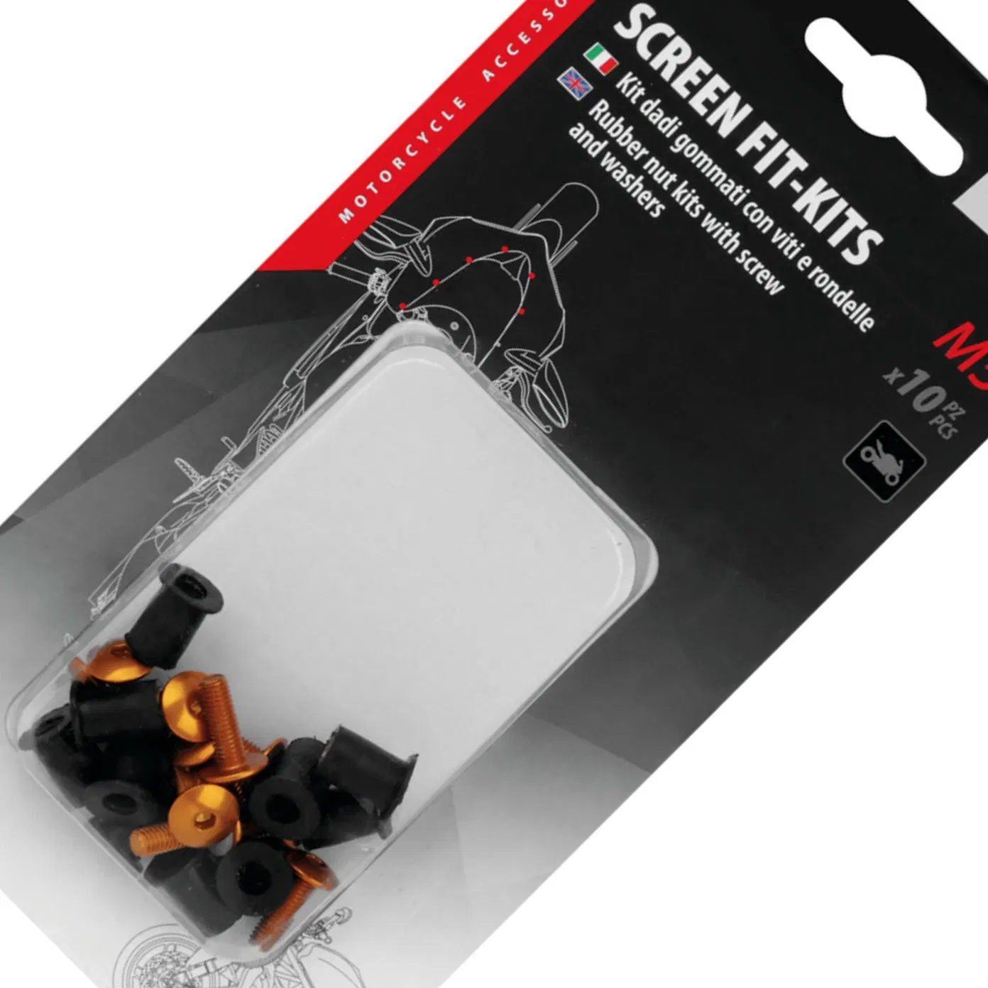 Zestaw 10 sztuk mocowań owiewek i szyb motocyklowych (każde mocowanie zawiera śrubkę, podkładki i gumowaną, samoblokującą nakrętkę)Anodowane aluminium. Idealne do owiewek i szyb motocyklowych.
