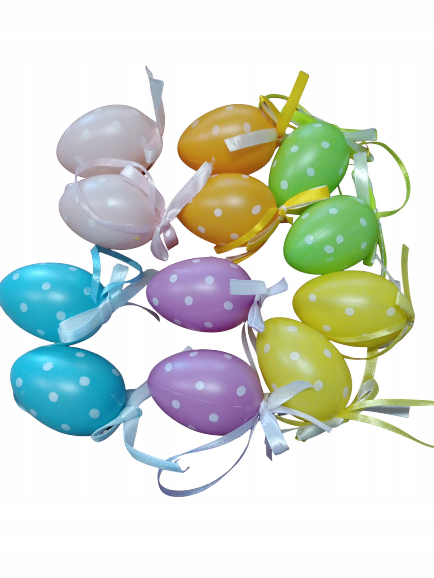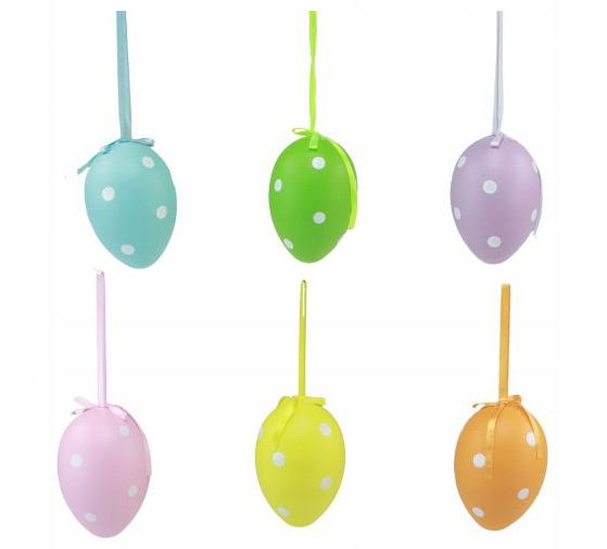 12 kolorowych jajek zawieszek o wysokości 6 cm – po 2 sztuki w każdym z 6 pastelowych kolorów:
