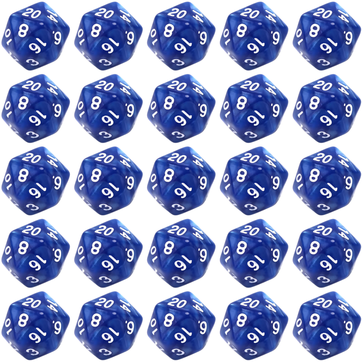 Komplet dwudziestu pięciu kości dwudziestościennych. Niezwykle wysoka jakość odlewu, precyzja żłobienia oraz malowania numerów czynią z nich podstawowy wybór dla wielu graczy, zarówno początkujących, jak i zaawansowanych.