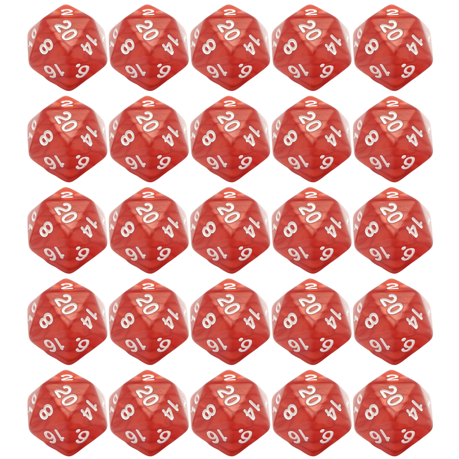 Komplet dwudziestu pięciu kości dwudziestościennych. Niezwykle wysoka jakość odlewu, precyzja żłobienia oraz malowania numerów czynią z nich podstawowy wybór dla wielu graczy, zarówno początkujących, jak i zaawansowanych.