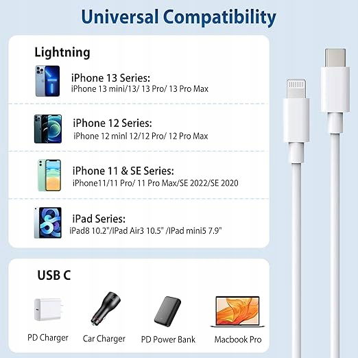 - 3-częściowy zestaw kabli USB C do iPhone'a-Avoalre kabel USB C do Lightning wykorzystuje najnowsze oryginalne złącze C94, bezpieczniejsze wsparcie dla ładowarek PD. Możesz także użyć tego kabla USB-C do iPhone'a z ładowarką USB‑C o mocy 18 W, 20 W, 29 W, 30 W, 61 W, 87 W lub 96 W, aby ładować urządzenia z systemem iOS lub iPadOS. Możesz nawet skorzystać z funkcji szybkiego ładowania w niektórych modelach iPhone i iPad.