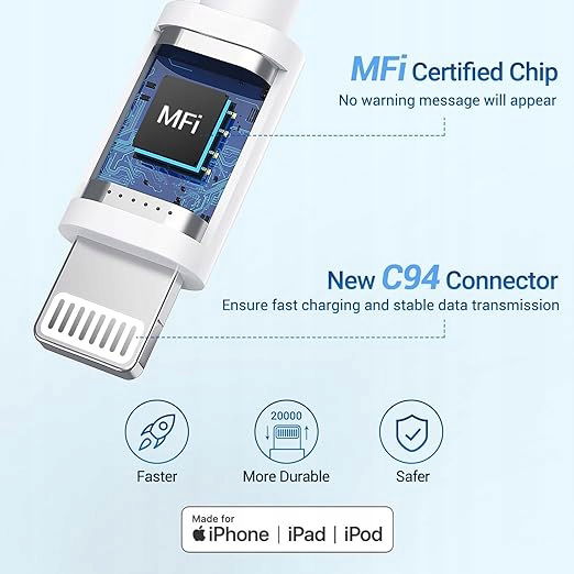 - Chip z certyfikatem MFi- Ten kabel iPhone Lightning do USB C ma certyfikat MFi i przeszedł rygorystyczne testy jakości, dzięki czemu urządzenia iOS mogą być ładowane bezpiecznie i tak szybko, jak to możliwe, bez wyskakujących powiadomień. Wbudowany chip chroni Twoje urządzenia kompleksowo dzięki ochronie przed przegrzaniem, przepięciom, przetężeniom i zwarciom. Zapewnia bezpieczeństwo iPhone/iPad również podczas szybkiego ładowania z najwyższą prędkością.
