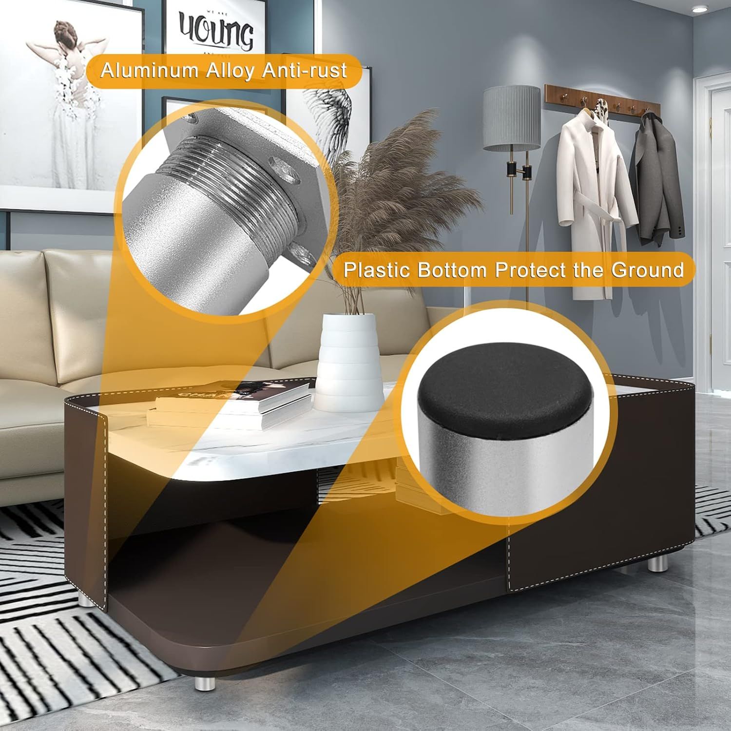 - Stabilność i ochrona: okrągłe nóżki zapewniają dobrą stabilność, a podkładki podłogowe z tworzywa sztucznego chronią podłogę przed zadrapaniami, idealna ochrona mebli i podłóg